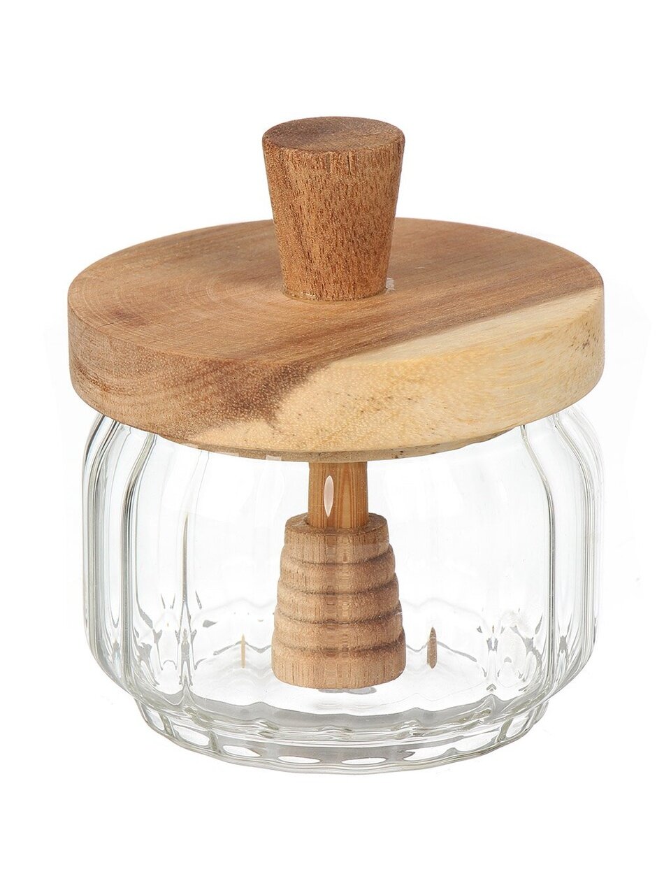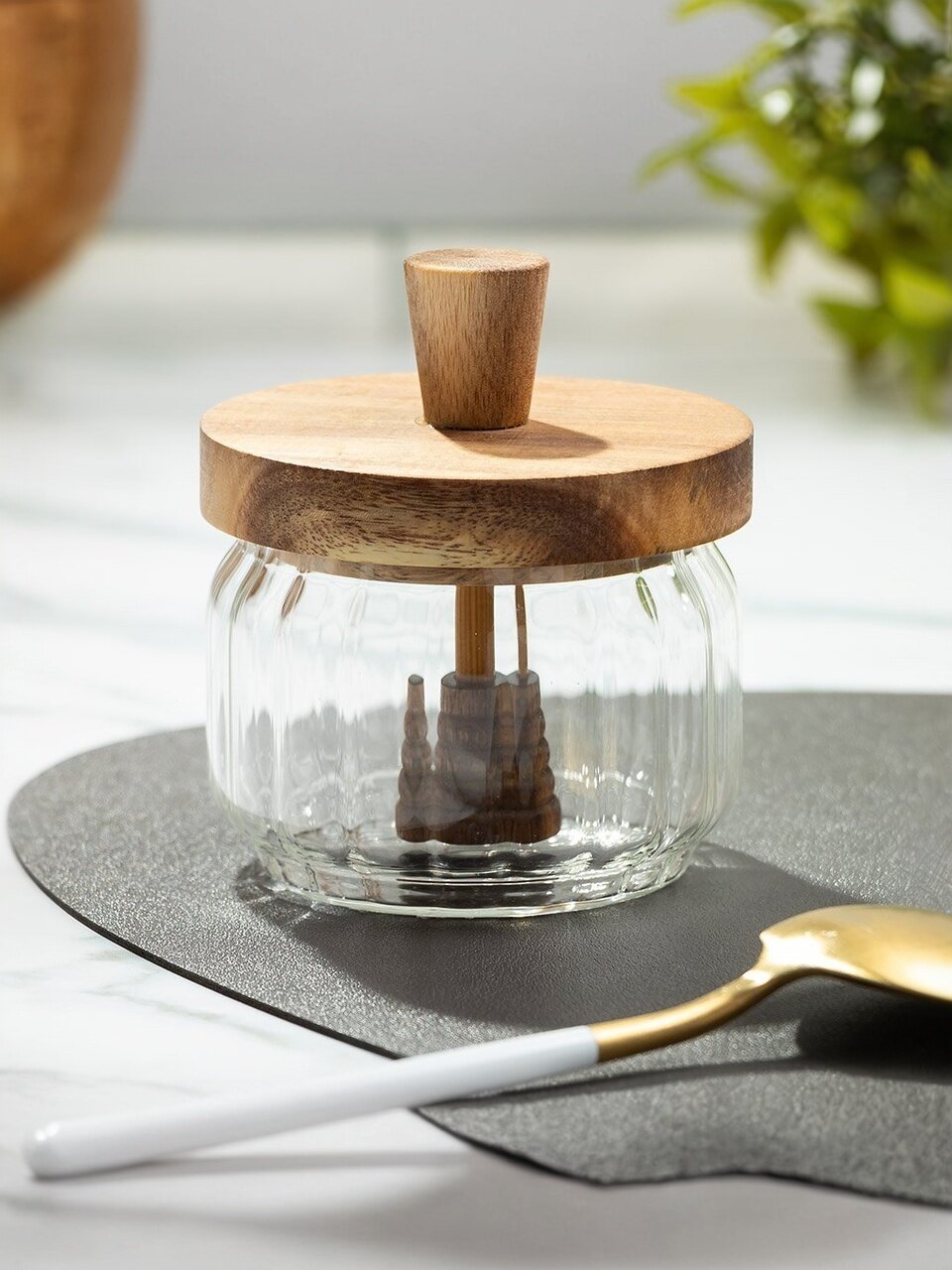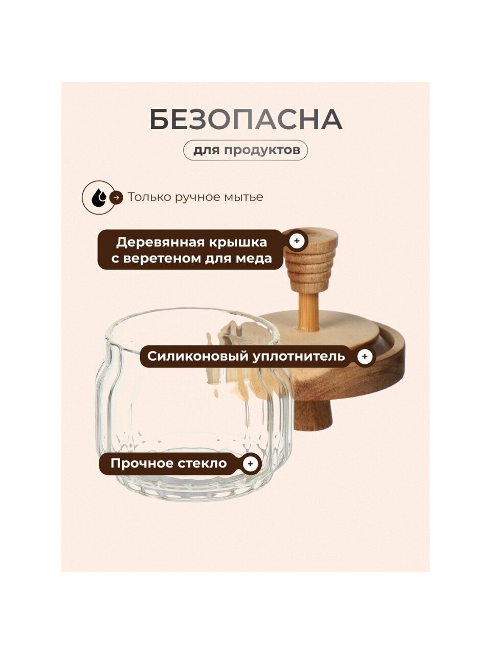 Крышка, изготовленная из дерева, придает банке естественный и экологичный вид, что особенно важно для хранения натуральных продуктов. Деревянная крышка плотно закрывает банку, защищая содержимое от внешних воздействий и сохраняя все полезные свойства меда. Это делает банку не только красивым, но и функциональным аксессуаром для хранения.