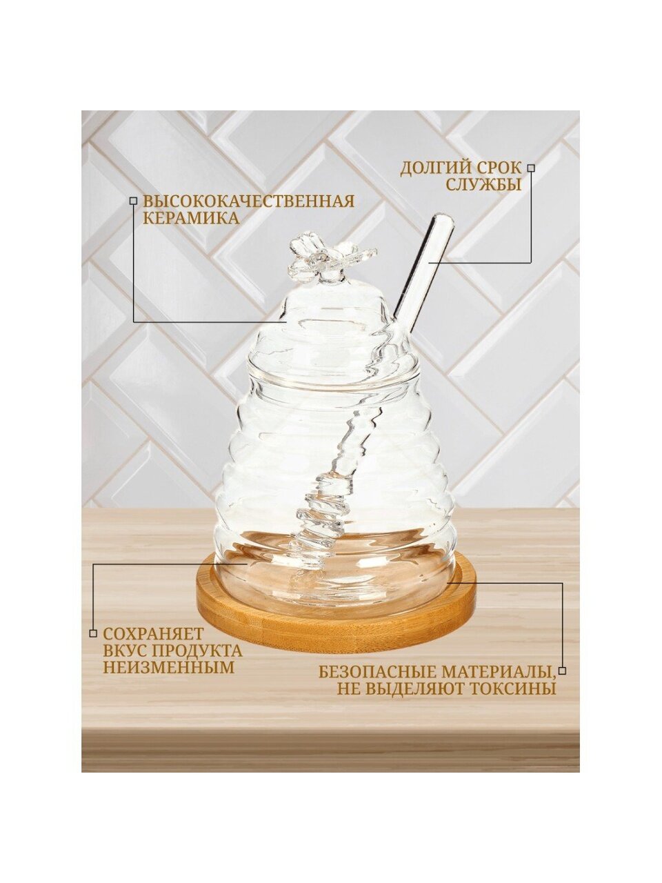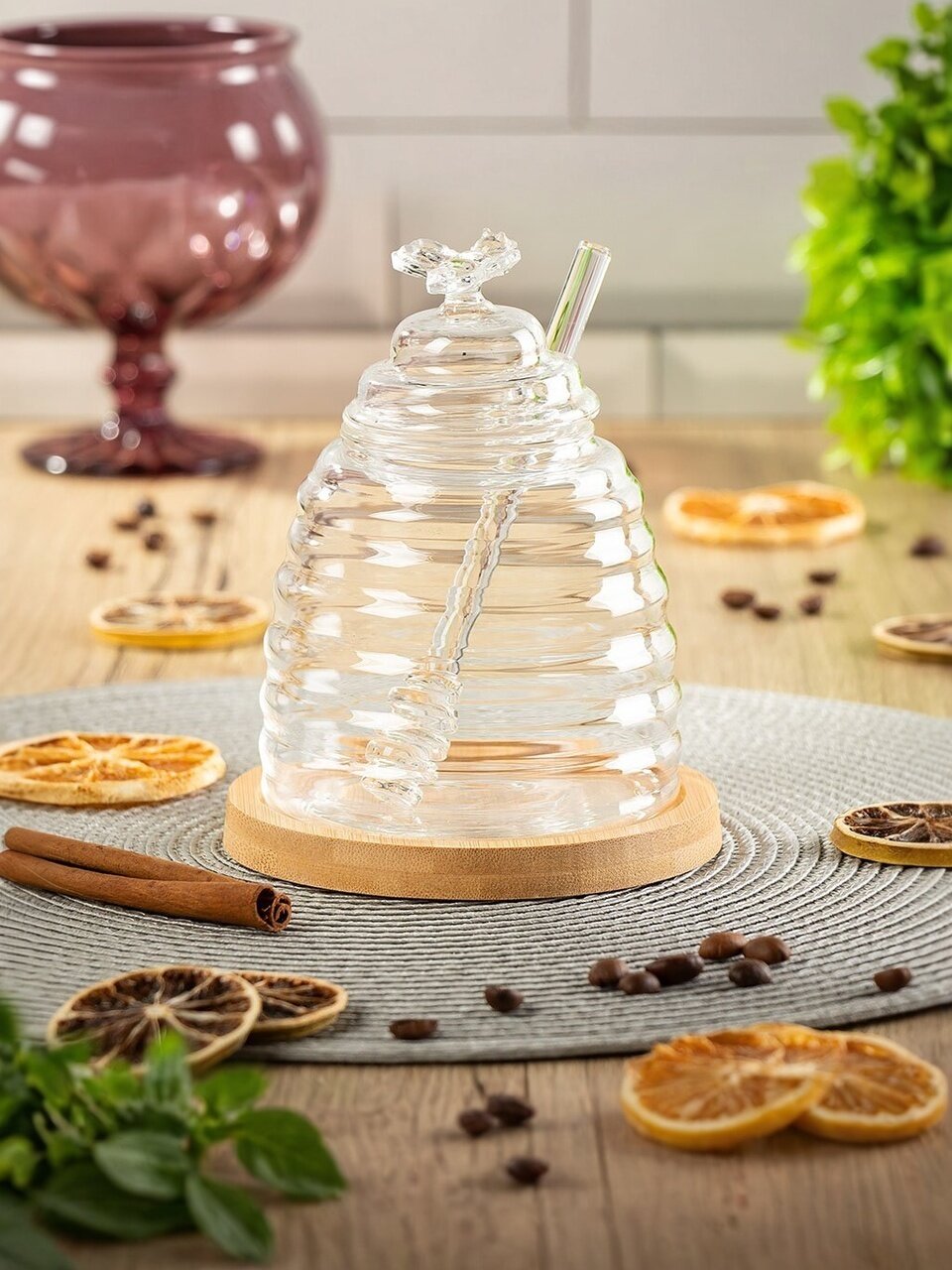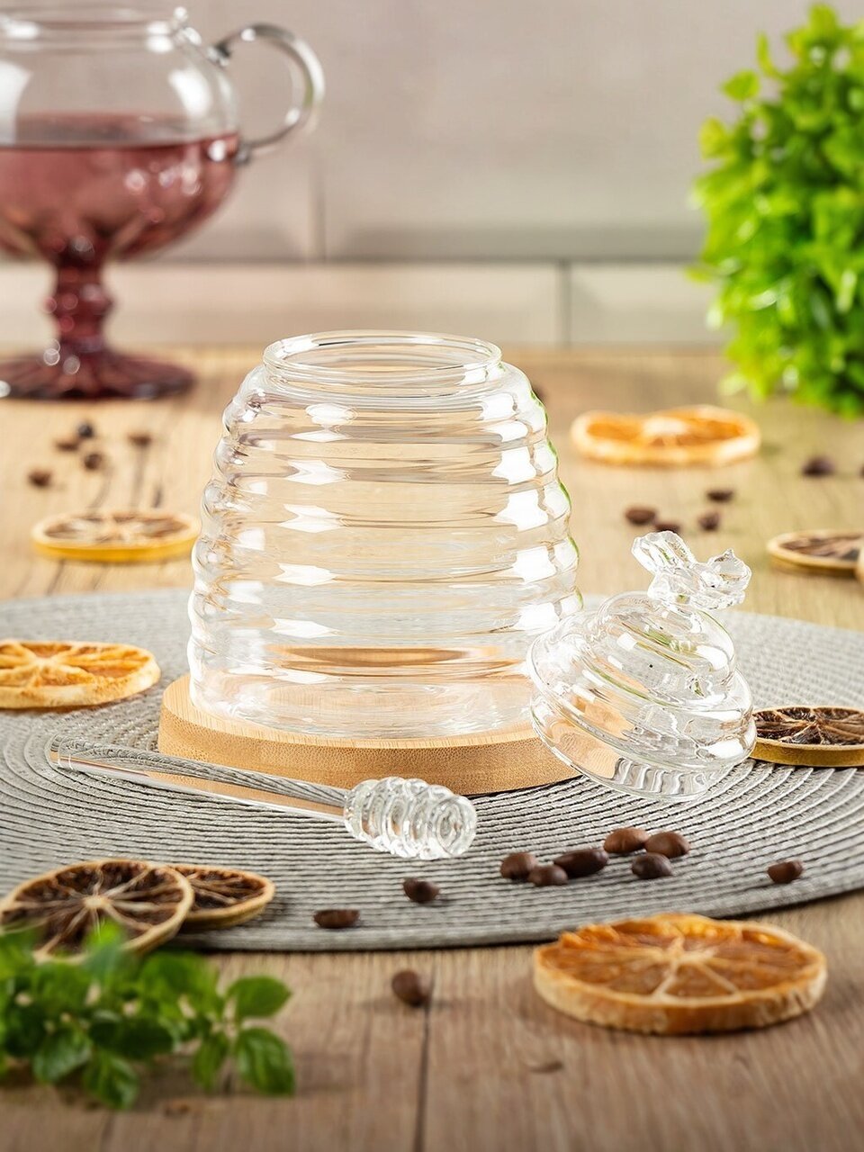Банка для меда с ложкой предназначена для сервировки десертного стола. Наполненная медом она будет одинаково красиво смотреться как на празднично сервированном столе, так и на ежедневном чаепитии.