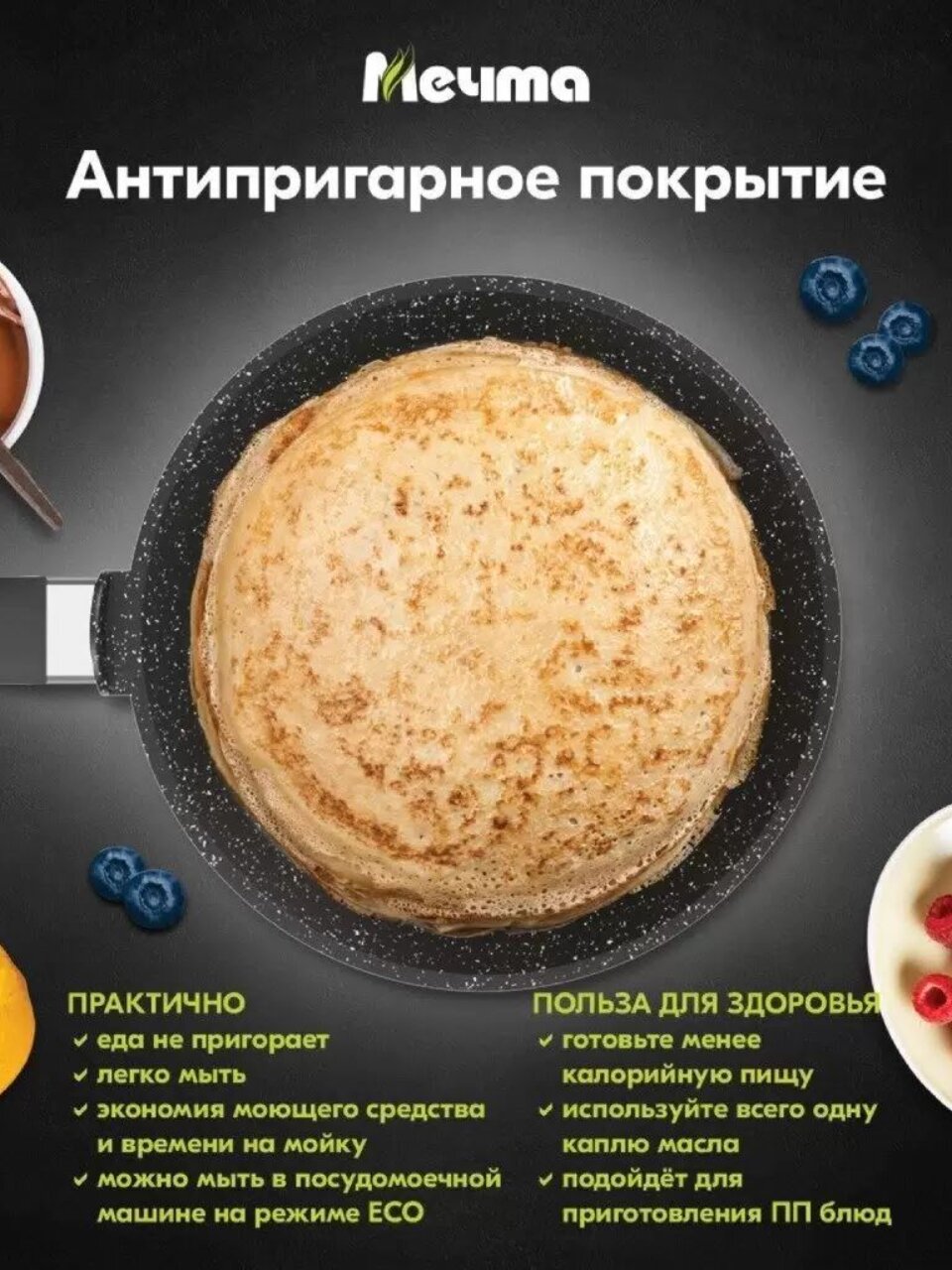 У каждой хозяйки должна быть сковорода блинница Гранит, предназначенная именно для выпечки блинов. Чтобы блинчики получались пышные и вкусные, а процесс приготовления не отнимал много времени и сил выбирайте сковороду блинную ТМ "Мечта" или блинницу гранит. Блинная сковорода - блинница Гранит с антипригарным покрытием имеет толстое дно, невысокие бортики и удобную ручку. Сковорода блинница гранит из литого высококачественного пищевого алюминия "Мечта" станет незаменимым инструментом и надежным помощником на вашей кухне.
