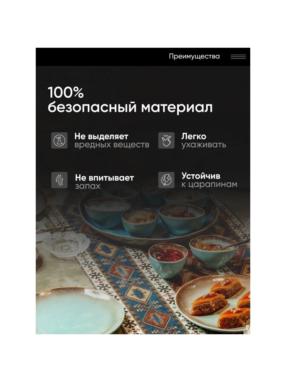 Диаметр 25 см, высота бортиков 3,5 см — удобно для салатов, плова, мяса, фруктов, горячих и холодных закусок.