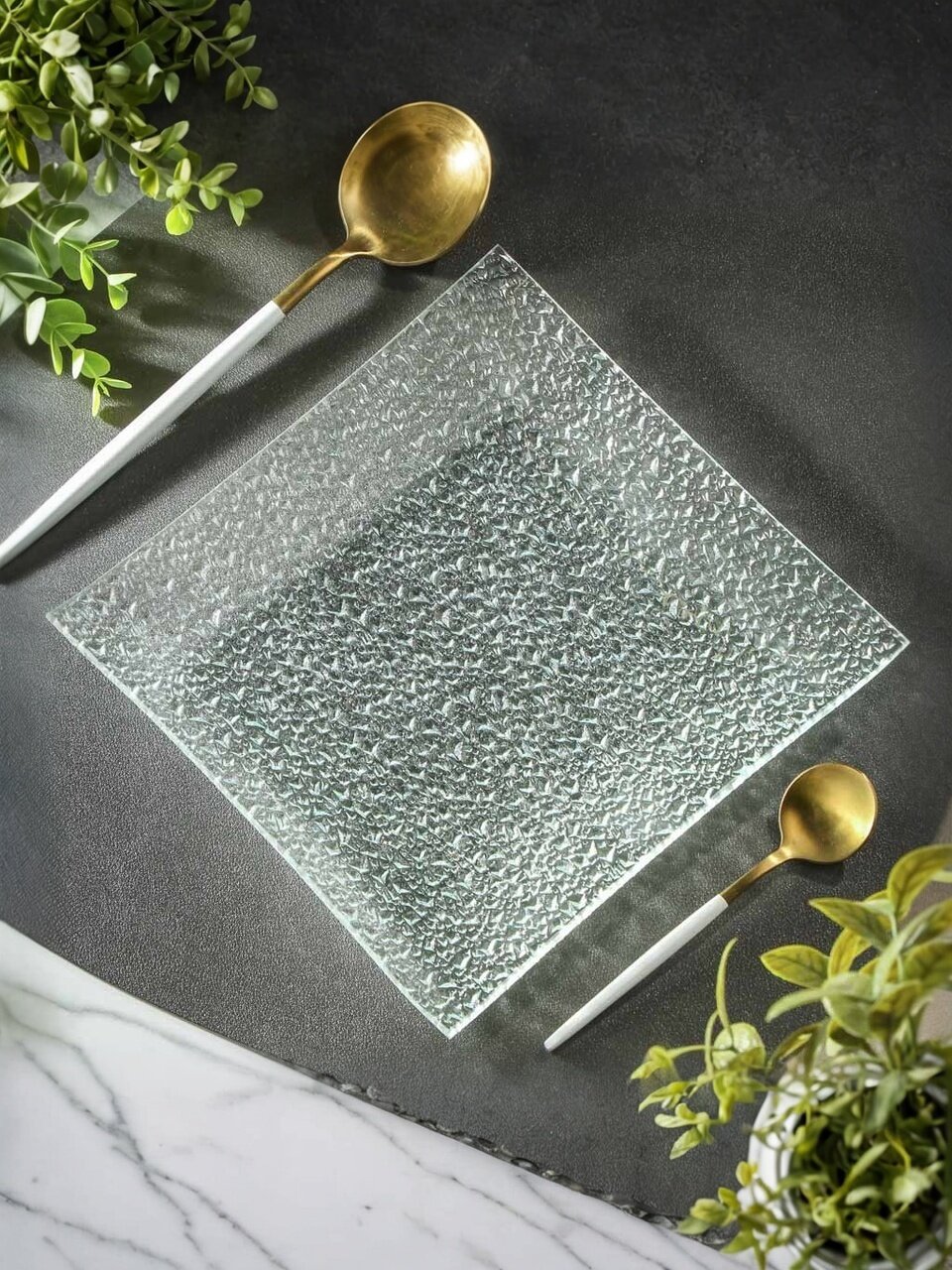 Стильное квадратное стеклянное блюдо 20х20 см «Лед пузырьки»: идеальное решение для сервировки закусок, сыра и нарезки — универсальность, долговечность, современный дизайн.