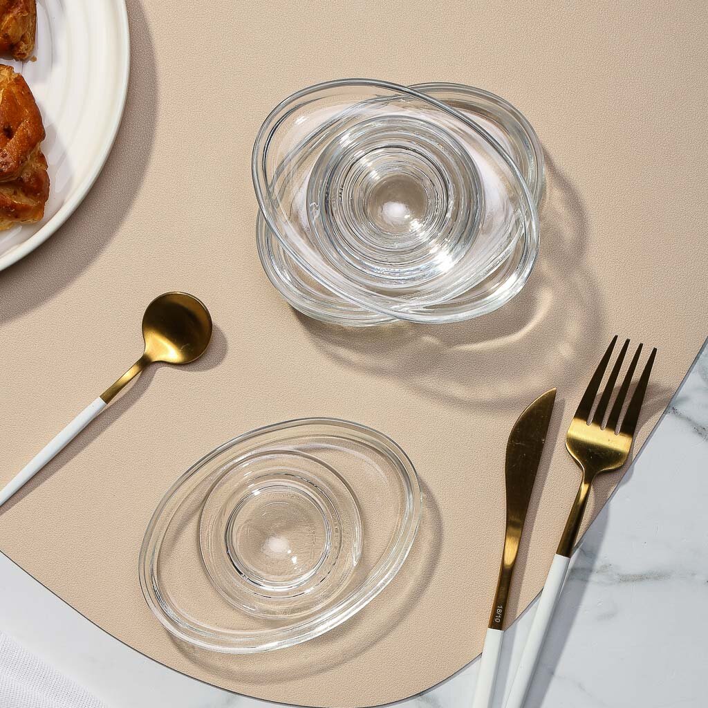 В наборе 4 блюда, диаметр каждого — 12.7 см (по внешнему краю), форма круглая, цвет прозрачный, без рисунка.