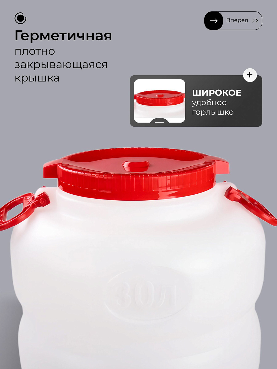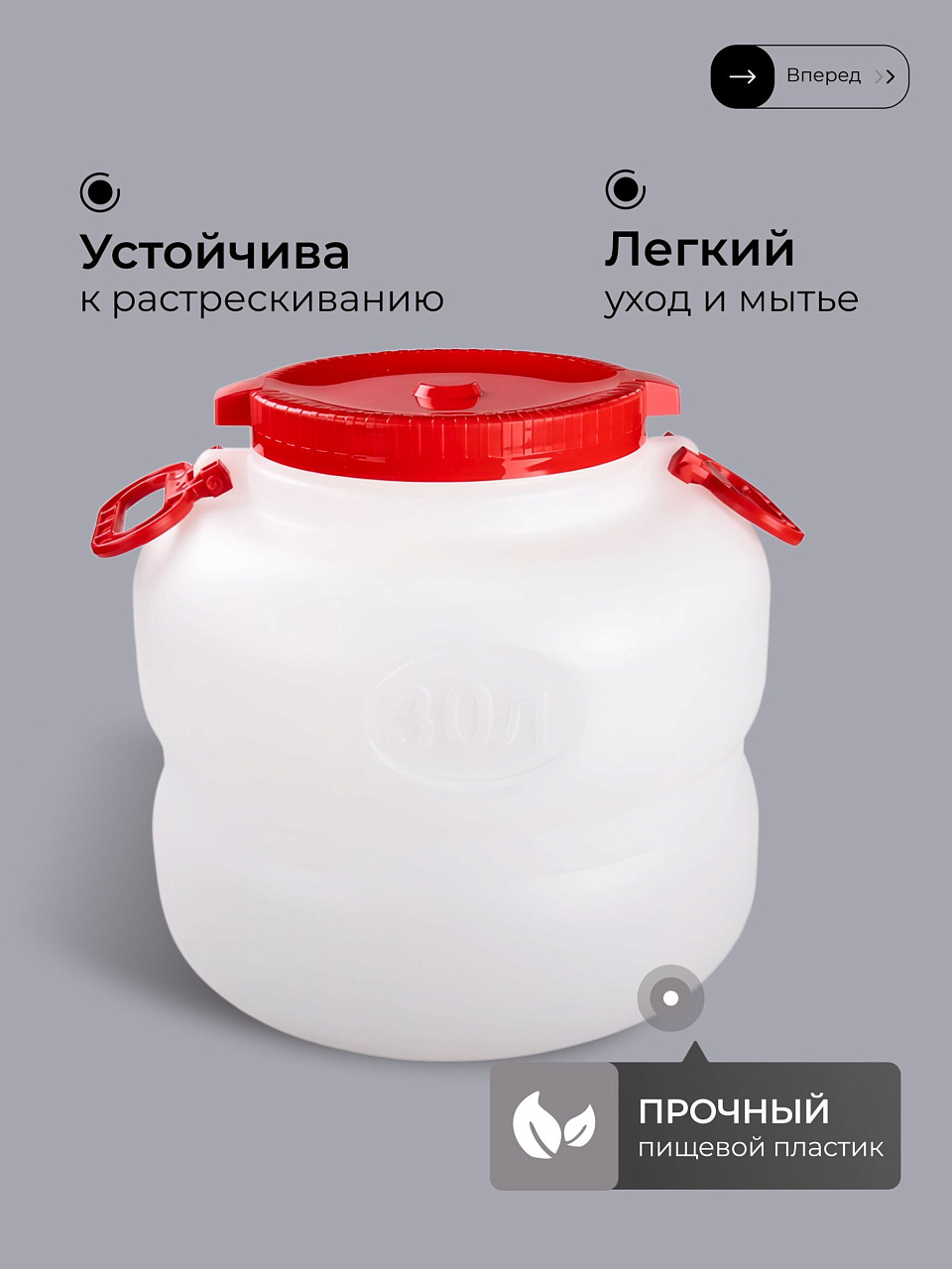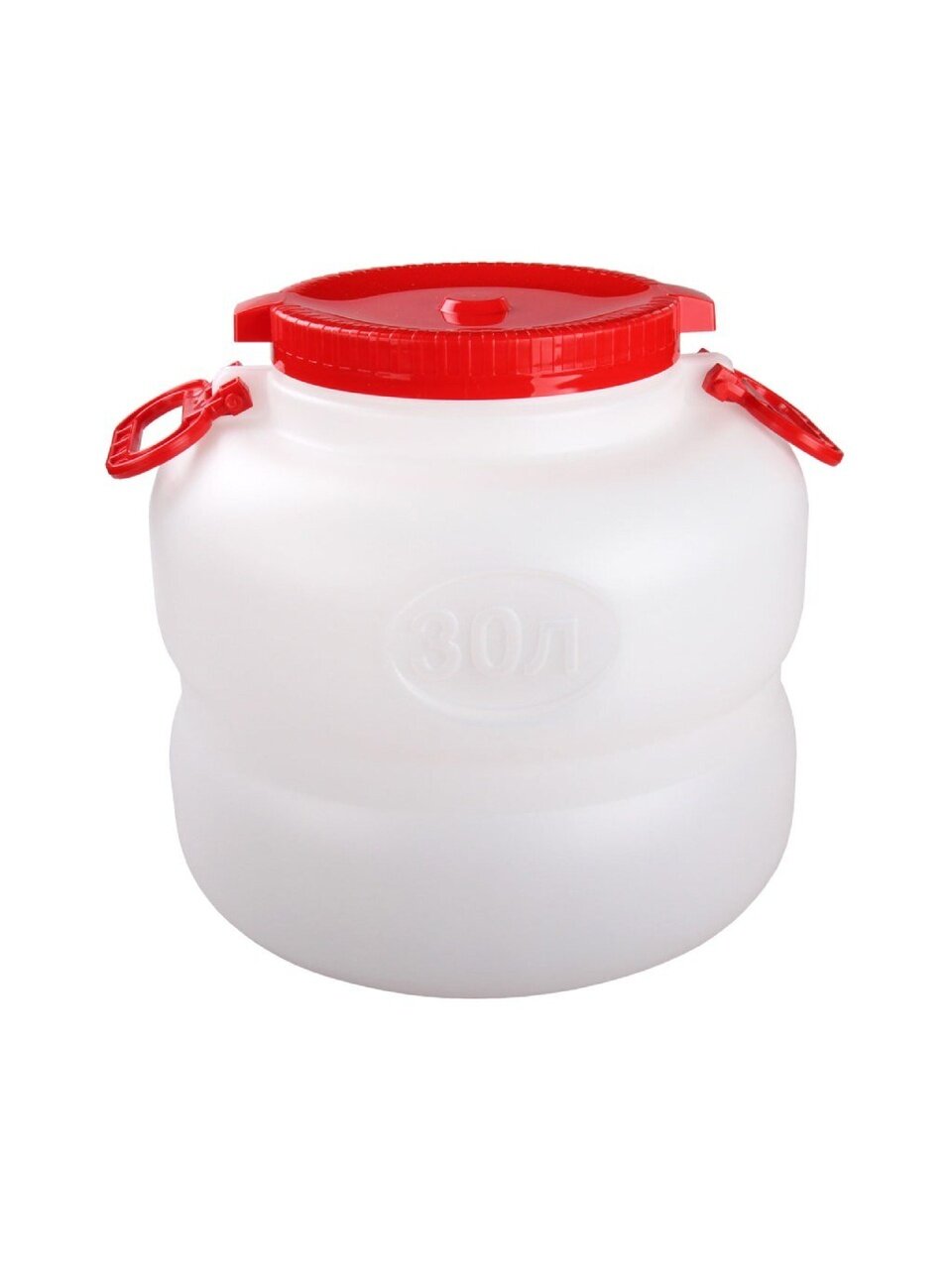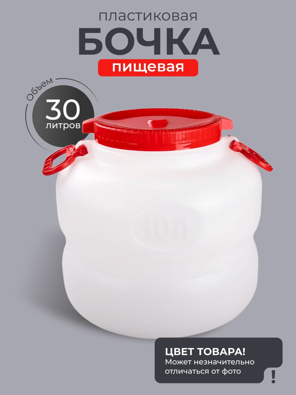 Бочка пластиковая 30 л для пищевых продуктов: легкая, прочная, с ручками, подходит для воды, хранения и перевозки. Выгодно купить для дачи и дома.