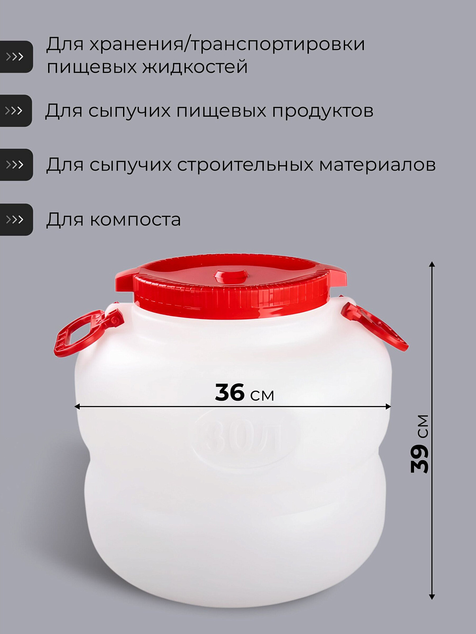 Да, благодаря объему 30 л и прочным ручкам, бочка удобна для воды, солений, компота, сыпучих продуктов — легко переносить и мыть.