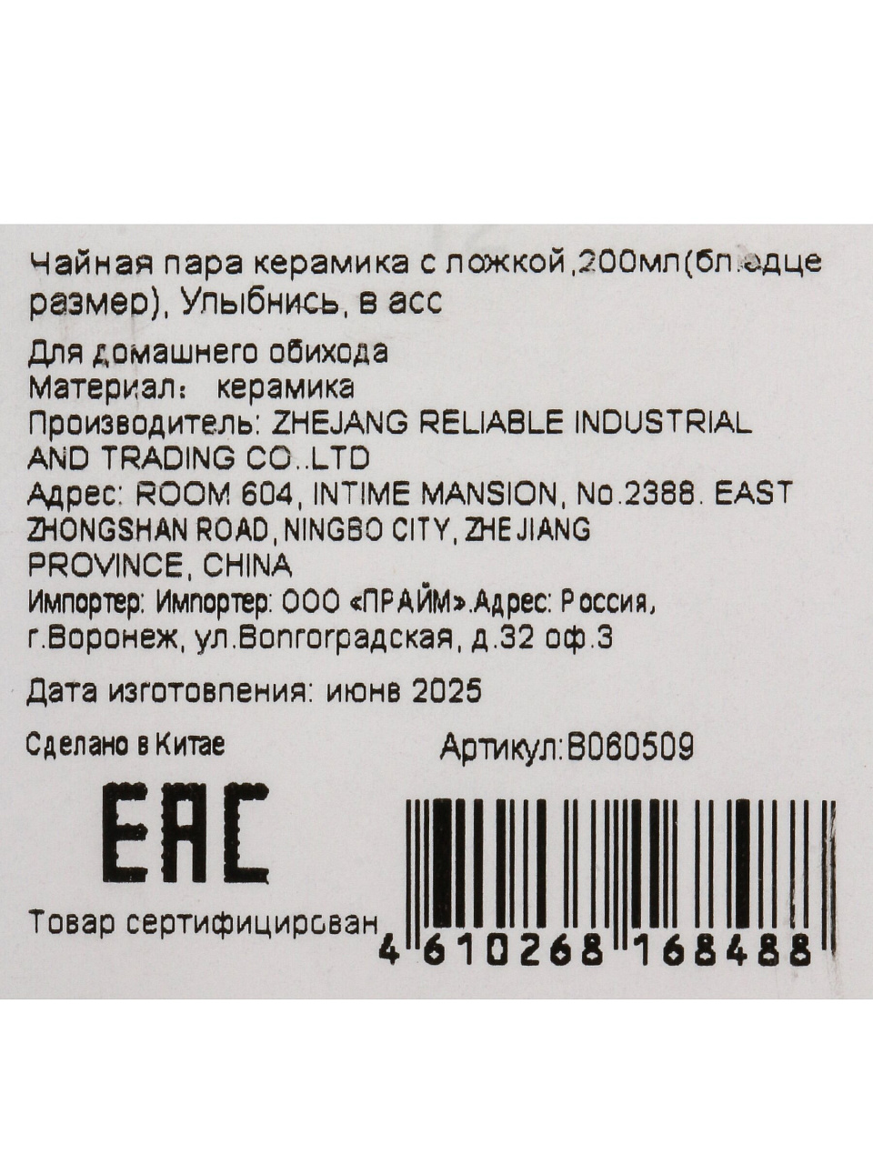 Вы можете приобрести «Чайная пара керамика, 3 предмета, на 1 персону, 200 мл, Улыбнись, B060509, в ассортименте» и другие товары в нашем интернет-магазине в Белгороде по низким ценам и с бесплатным самовывозом.