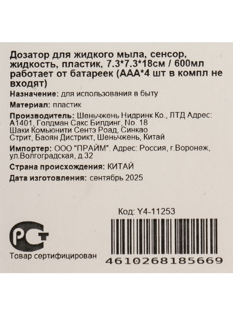 Выбирая сенсорный дозатор Y4-11253, вы получаете современное решение для чистоты и экономии. Закажите сейчас — выгодная цена, быстрая доставка и гарантия качества.