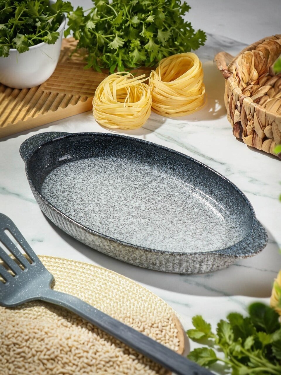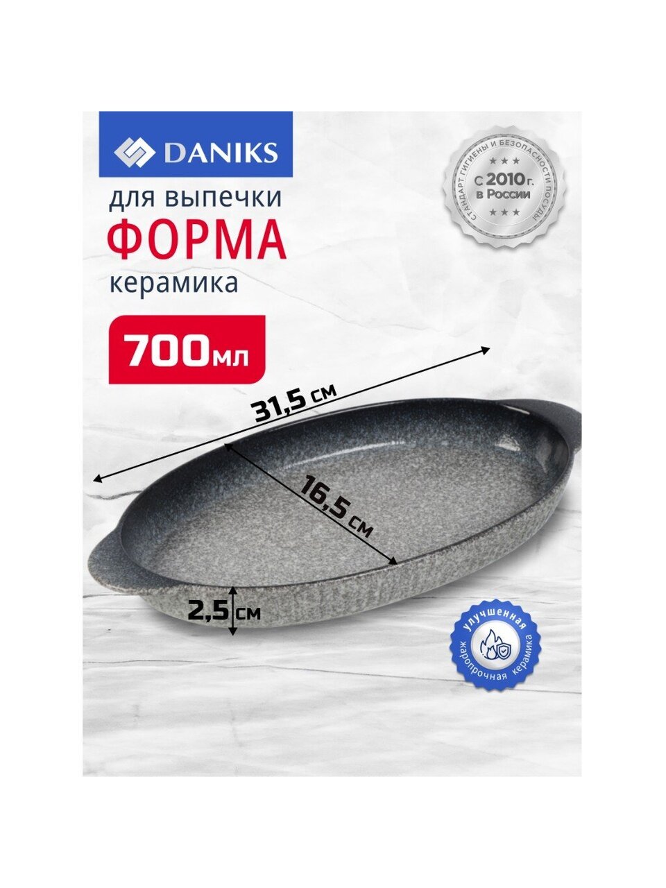Овальная керамическая форма Daniks Гранит 0.7 л: идеальный выбор для выпечки, запекания мяса и рыбы дома и на даче. Безопасно для СВЧ и посудомойки.