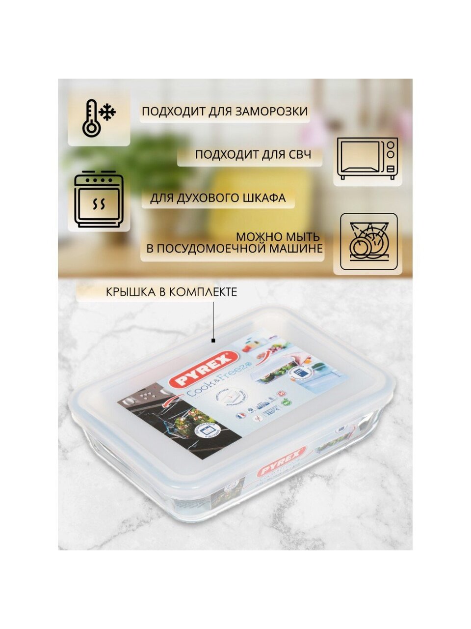 Форма для запекания Pyrex Cook Freez 0.8 л с крышкой: стекло без запаха, компакт 14×19 см, подходит для духовки, СВЧ и посудомойки.