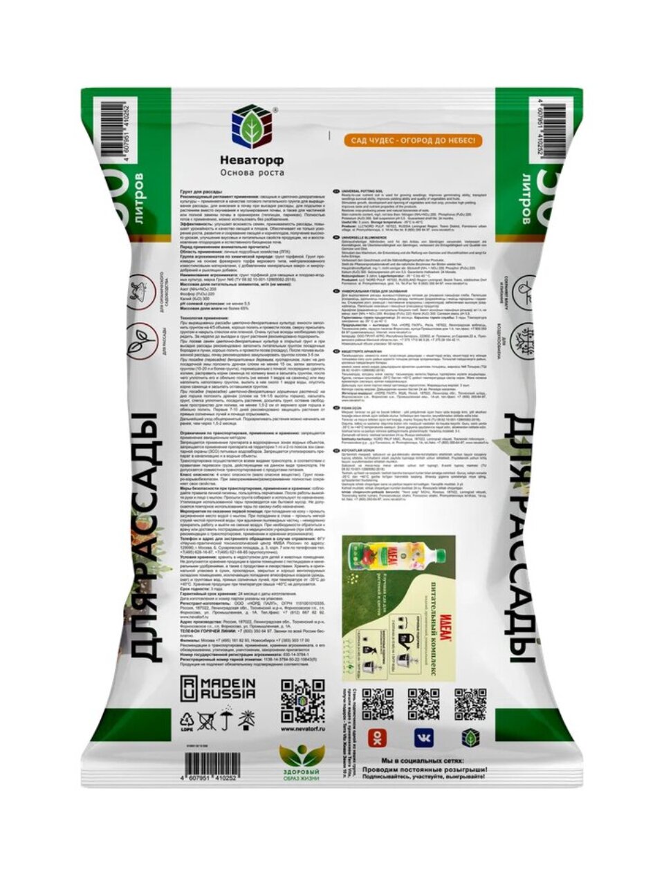 Объём упаковки — 50 литров. Этого достаточно для заполнения 10-15 стандартных ящиков для рассады или для обогащения почвы на нескольких грядках.