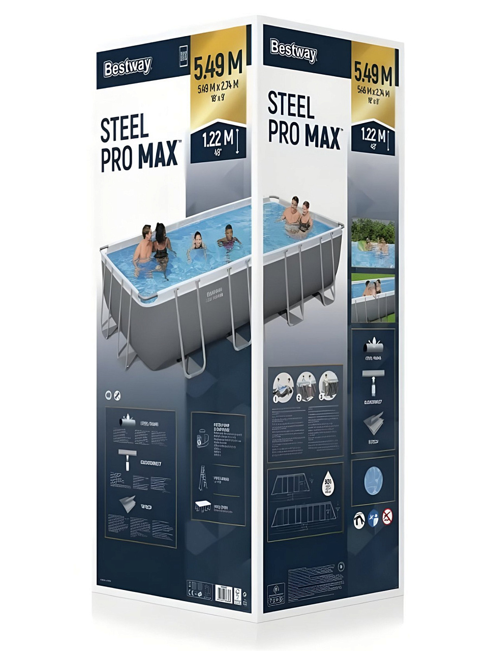 Сборка занимает до 120 минут. Чаша из трёхслойного ПВХ, каркас — сталь, бортик высокий (122 см), монтажный размер 594х314 см.