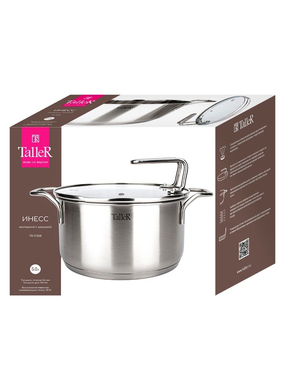 Кастрюля Taller Инесс 5 л из нержавеющей стали 18/10 с капсульным дном — оптимальный выбор для индукционных плит, быстрой готовки и стильной сервировки.