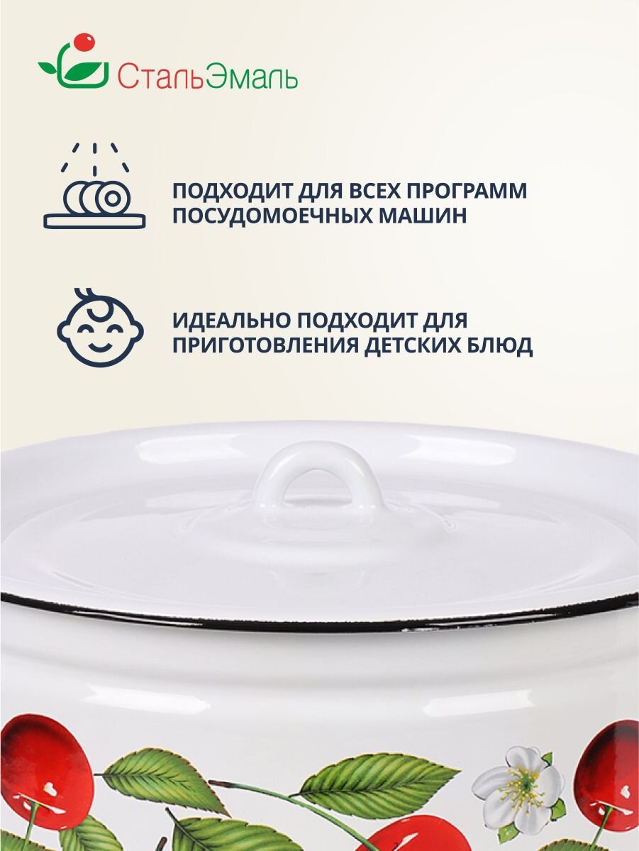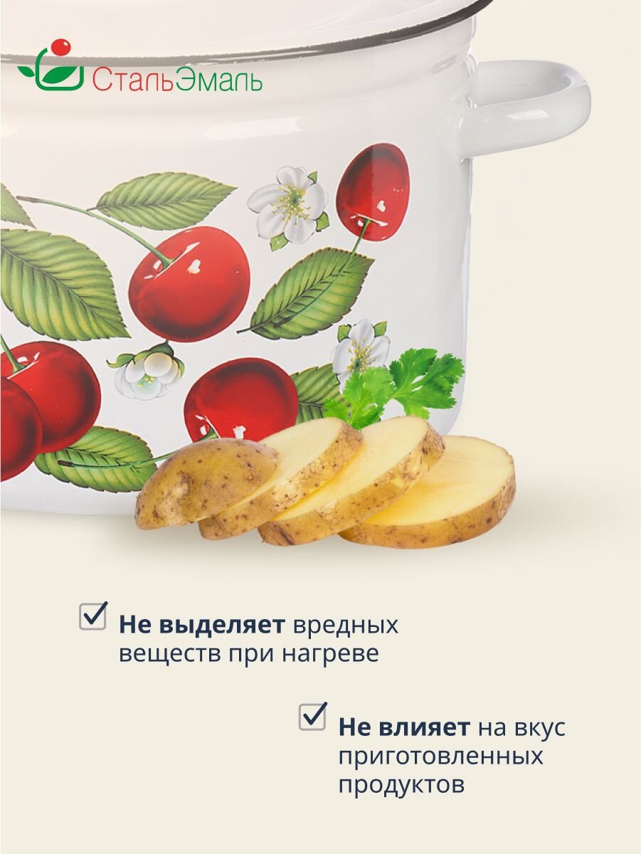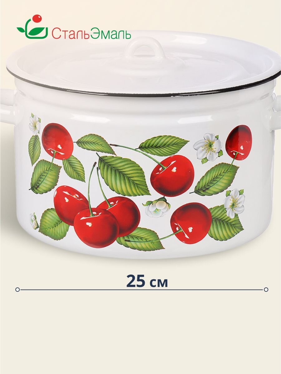 Кастрюля "Вишня ягоды" из эмалированной стали понадобится на каждой кухне: дома и на даче, любителю кулинарии и профессиональному повару. Такое изделие прекрасно подходит для приготовления супов, рагу, компотов и киселей. Кастрюля цилиндрической формы изготовлена из эмалированной стали в соответствии с требованиями ГОСТ 24788-2018, толщина эмали не менее 0.20 мм.