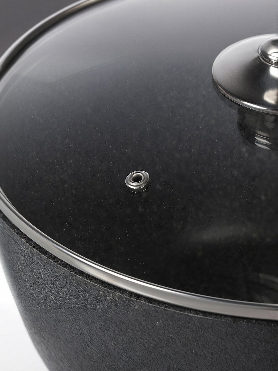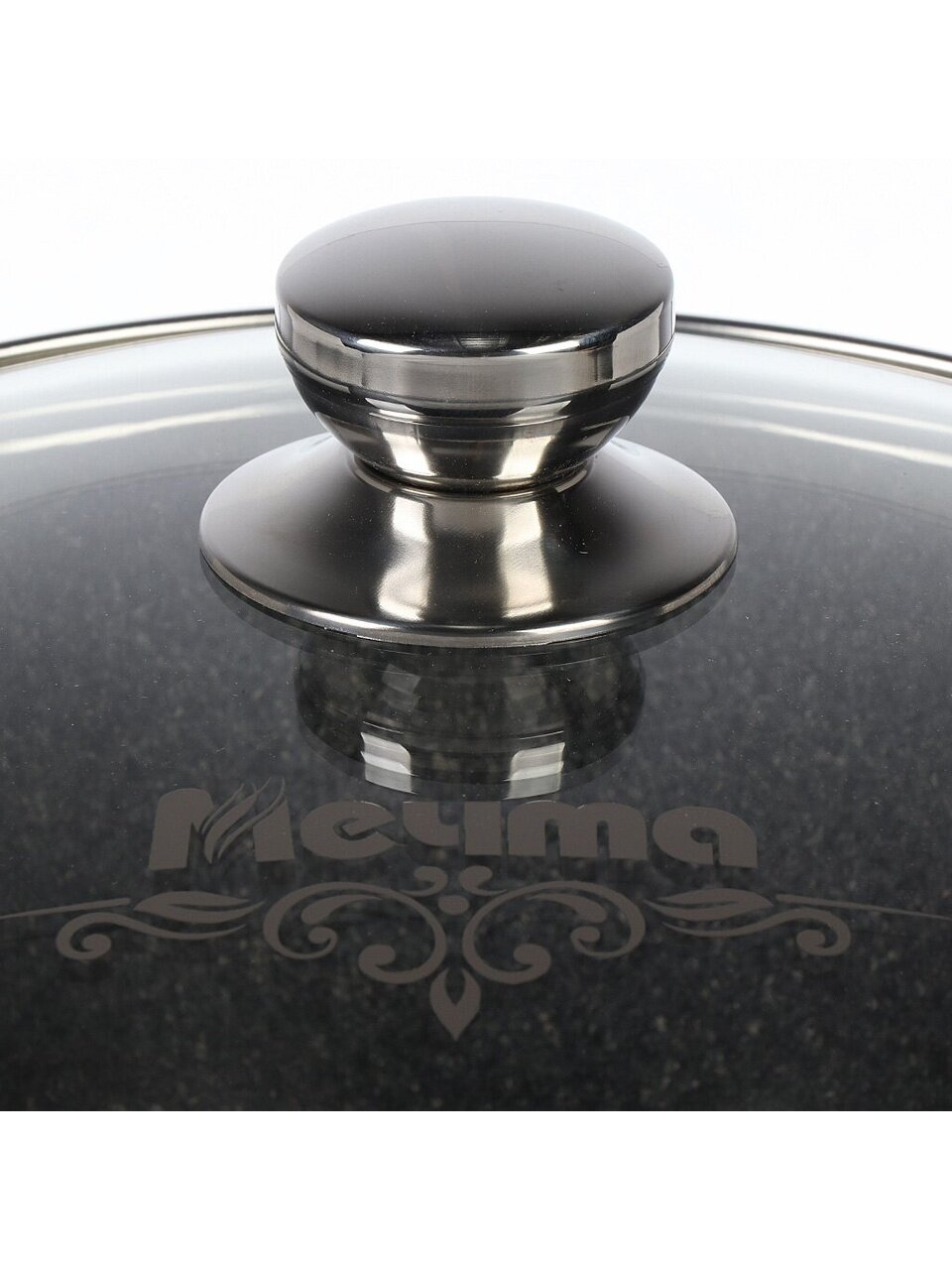 Кастрюля алюминиевая Мечта Premium grey 5 л — это современное решение для тех, кто ищет, какую кастрюлю выбрать для семьи или дачи. Прочное гранитное антипригарное покрытие предотвращает пригорание и облегчает уход: просто поместите кастрюлю в посудомоечную машину. Толстое дно (6 мм) равномерно распределяет тепло, что особенно важно для супов, плова или каши. Стеклянная крышка с выпускным клапаном позволяет контролировать процесс готовки и сохраняет вкус блюд.