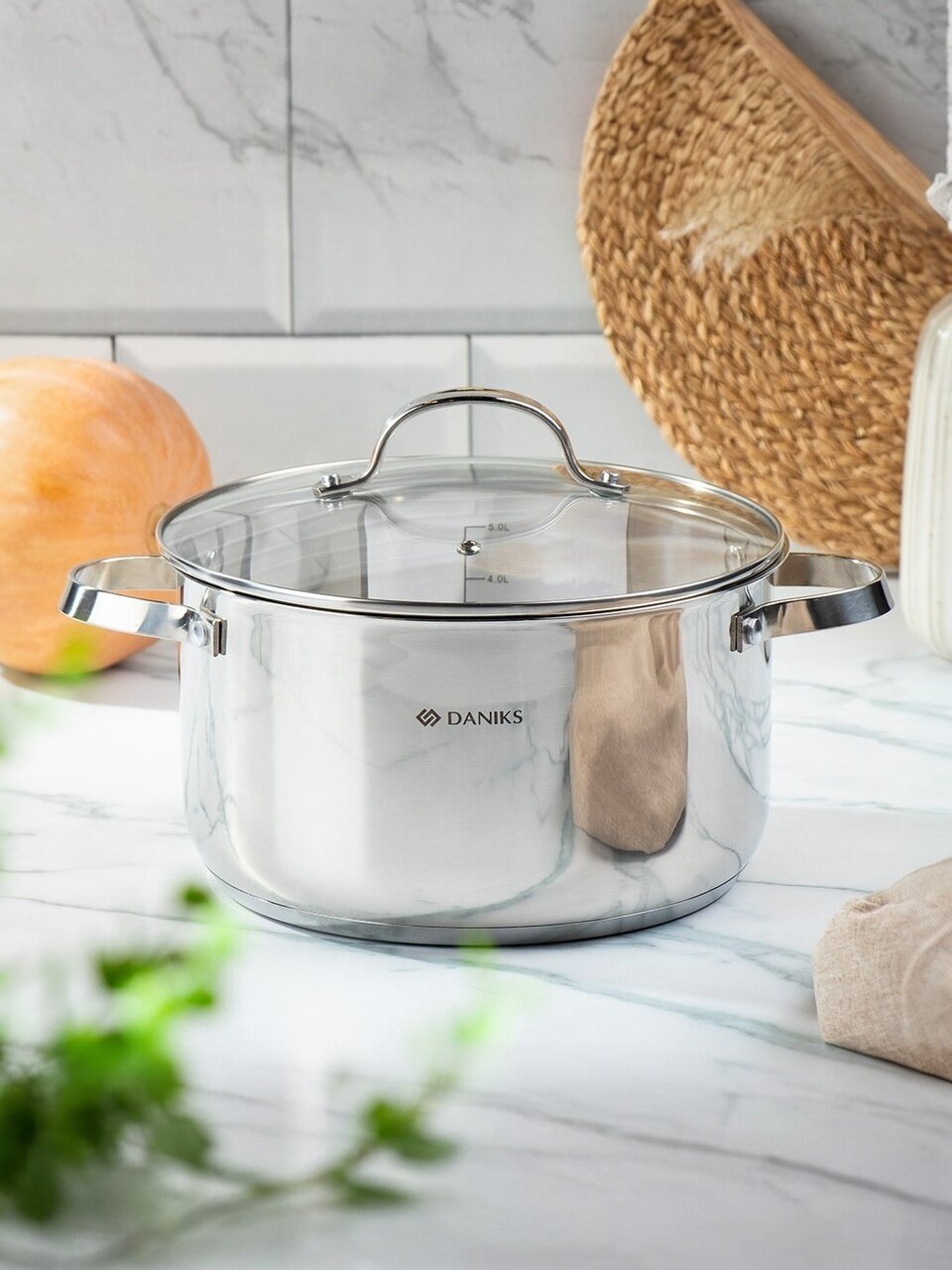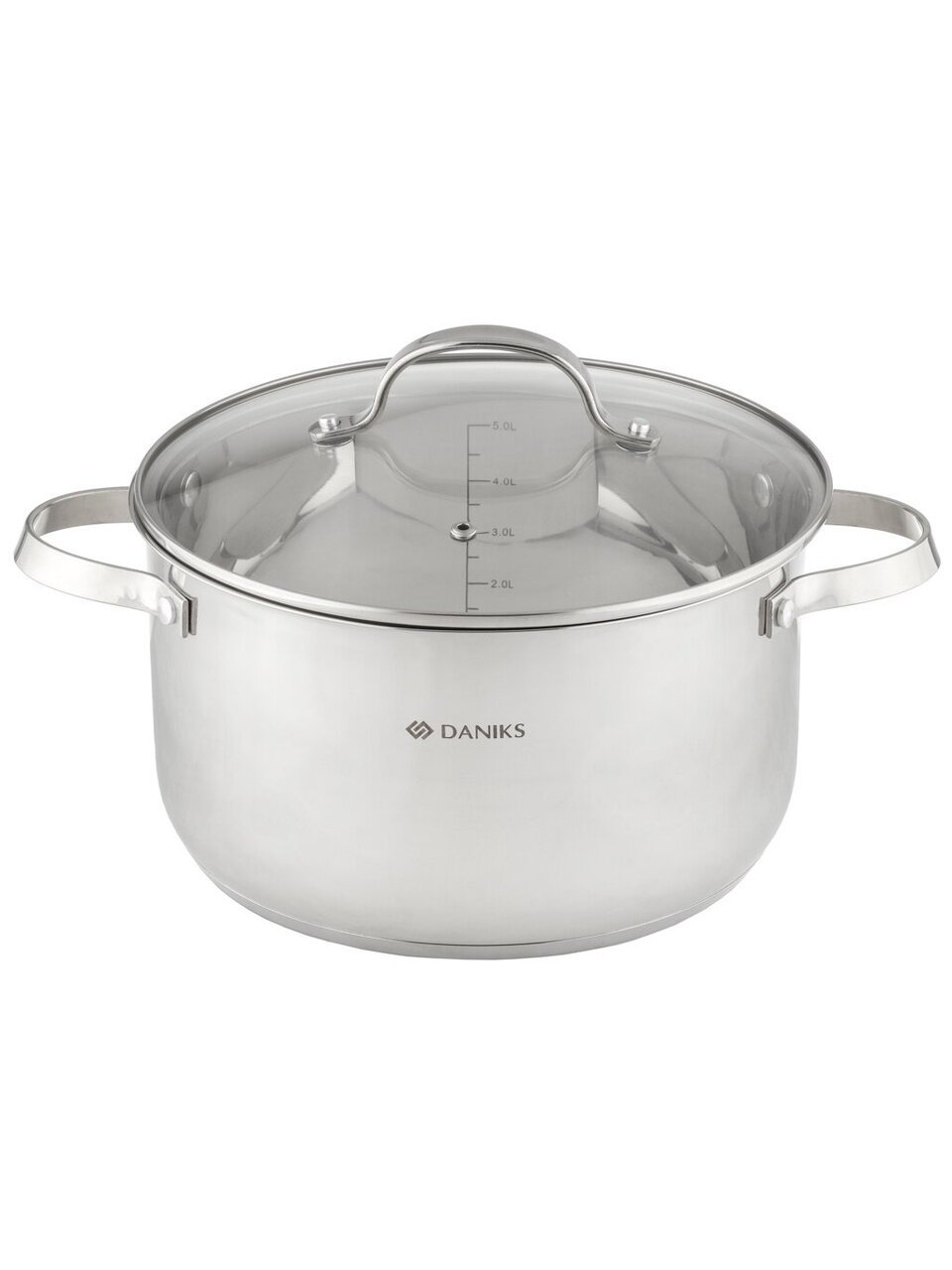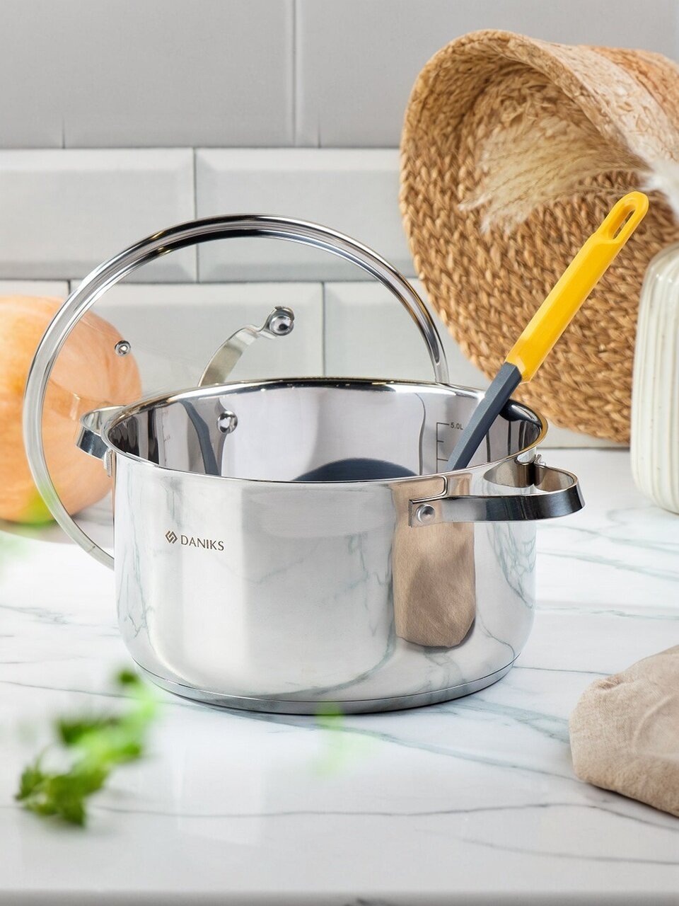 Кастрюля из нержавеющей стали Daniks Элегант 6.1 л с капсульным дном и стеклянной крышкой — оптимальный выбор для семьи: готовьте супы, каши и пельмени без пригорания и хлопот.