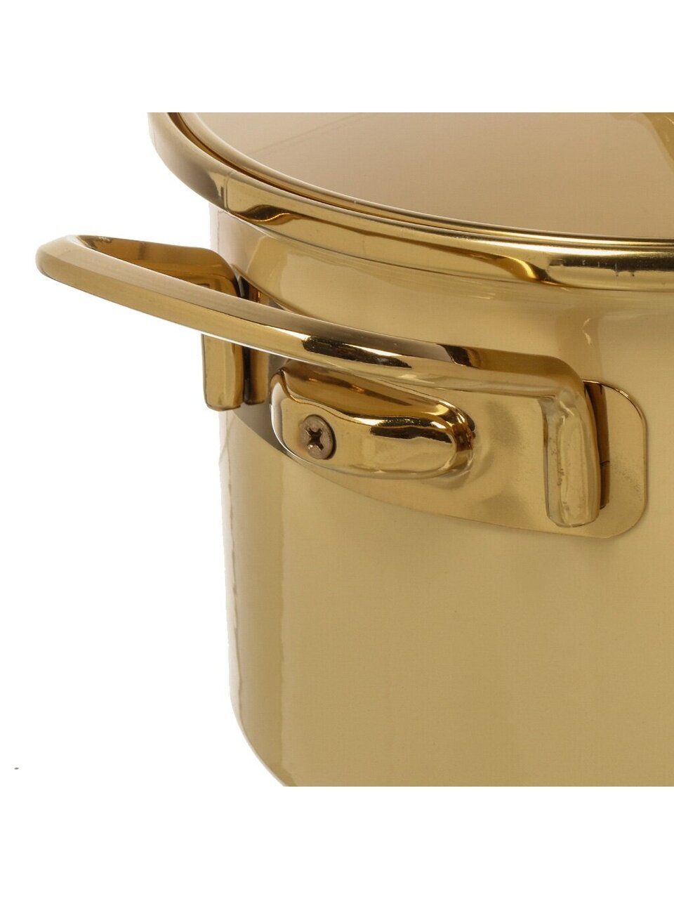Объём — 2,1 литра, диаметр — 16 см, вес — 1,15 кг. Кастрюля оснащена стеклянной крышкой с клапаном и золотистыми ручками.