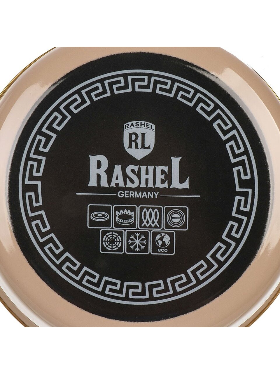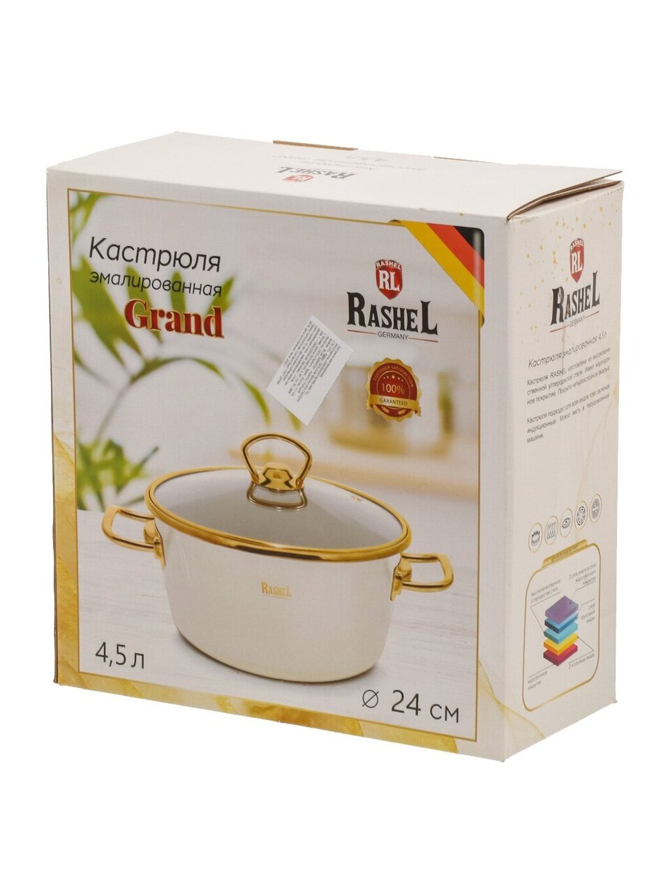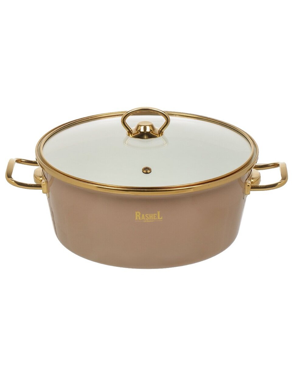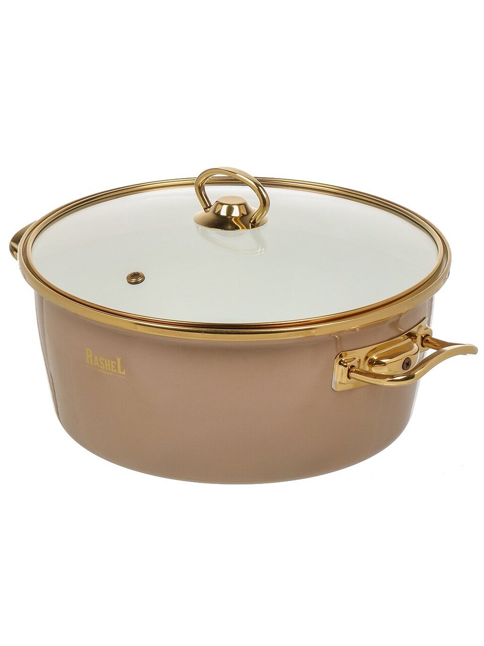 Кастрюля бренда RasheL сделана из высококачественной стали с блестящим эмалированным покрытием внутри и снаружи.