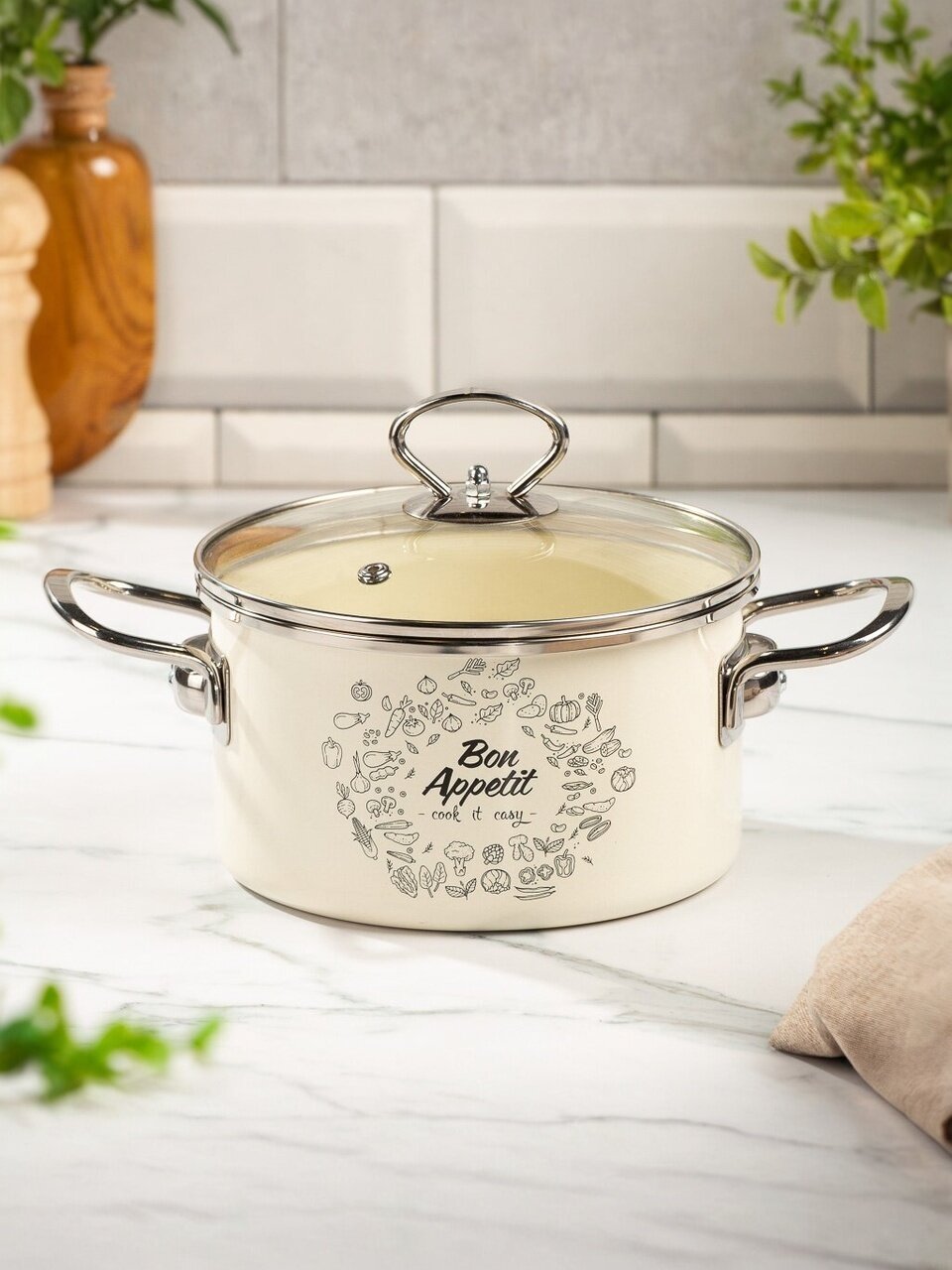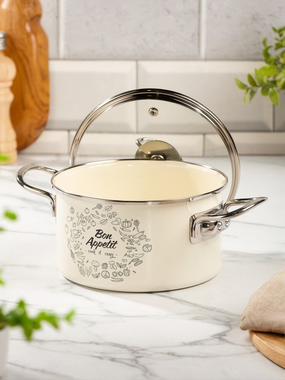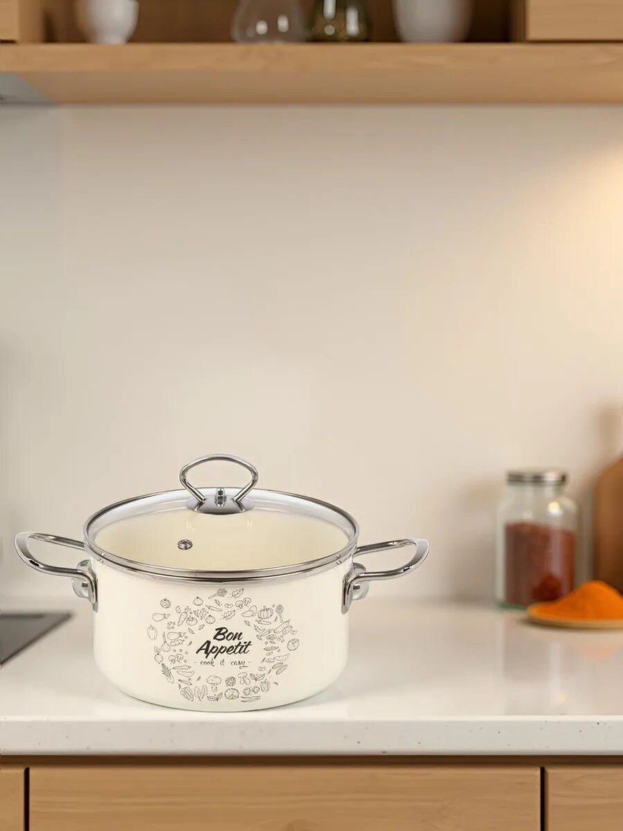 - Безопасная эмалированная сталь: объём 2 литра, цилиндрическая форма, крышка из прочного стекла