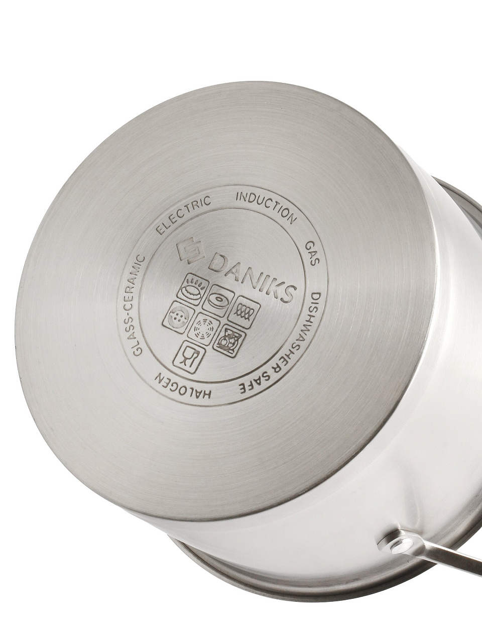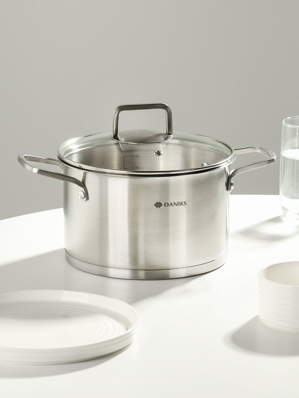 Кастрюля Daniks Ирати 3.9 л: нержавеющая сталь 304, стеклянная крышка с клапаном, подходит для индукции, идеальна для супа и компота.