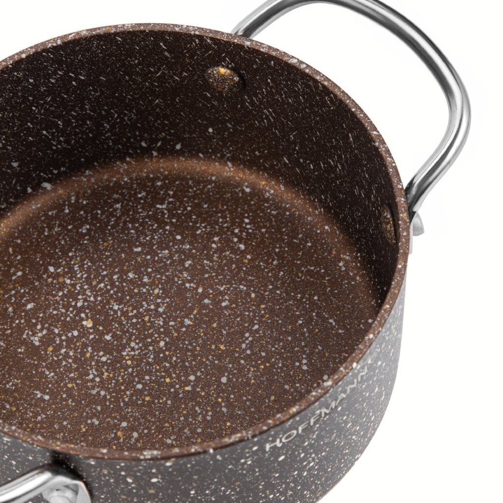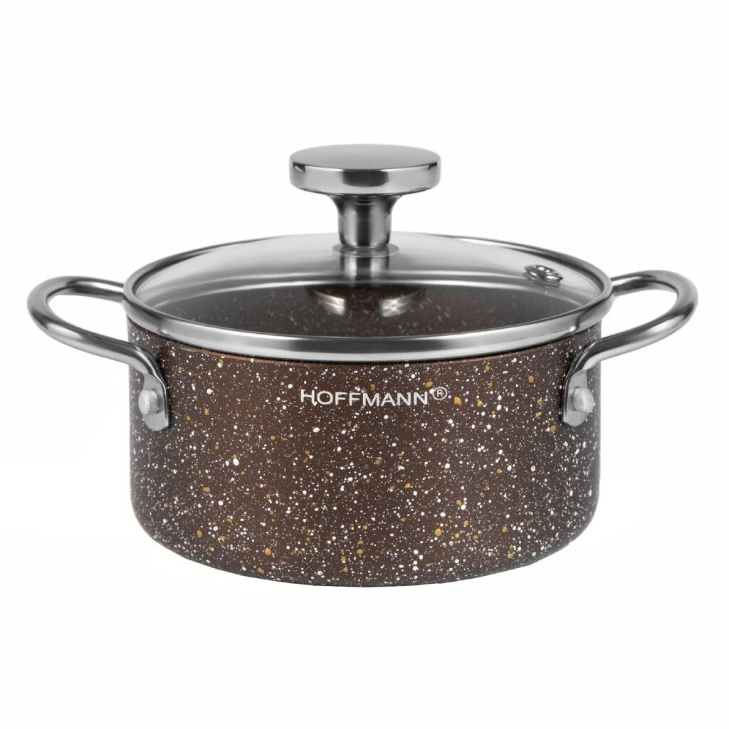 Удобный объём 1,2 литра подойдёт для небольших порций — отличный выбор для дачи, маленькой кухни, студенческого общежития или в подарок. Натуральный дизайн «коричневый мрамор» впишется в любой интерьер. При заказе у нас вы получаете гарантию оригинального качества и быструю доставку. Не откладывайте — купите недорого кастрюлю Hoffmann с антипригарным покрытием для дома или дачи прямо сейчас.
