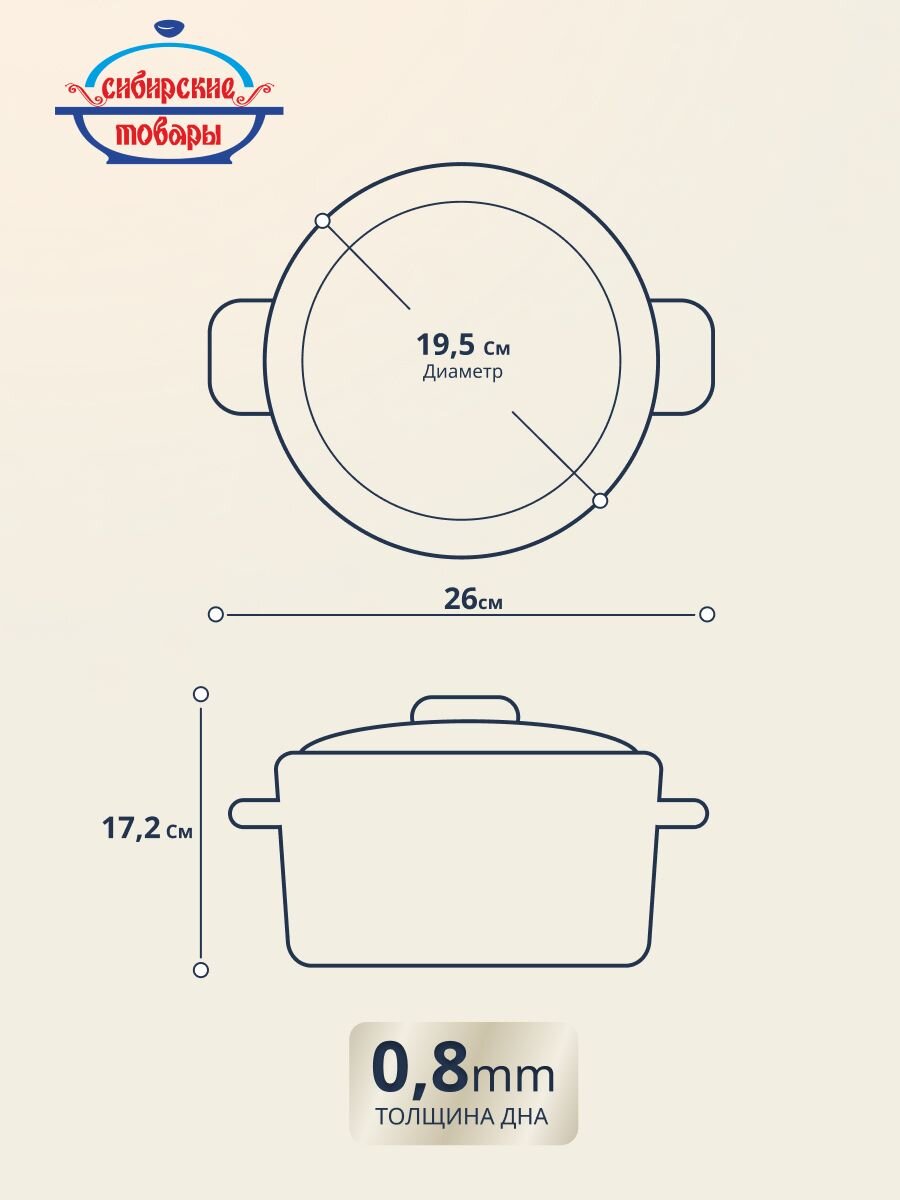 Диаметр 19 см, объем 3 литра. Высота с крышкой — 17,2 см, без крышки — 12,3 см. Этого достаточно для семьи из 2–4 человек.