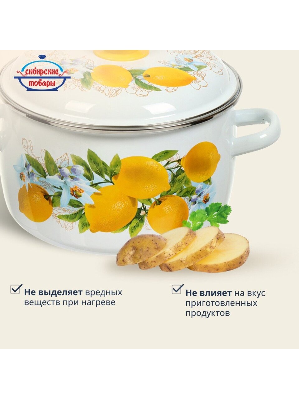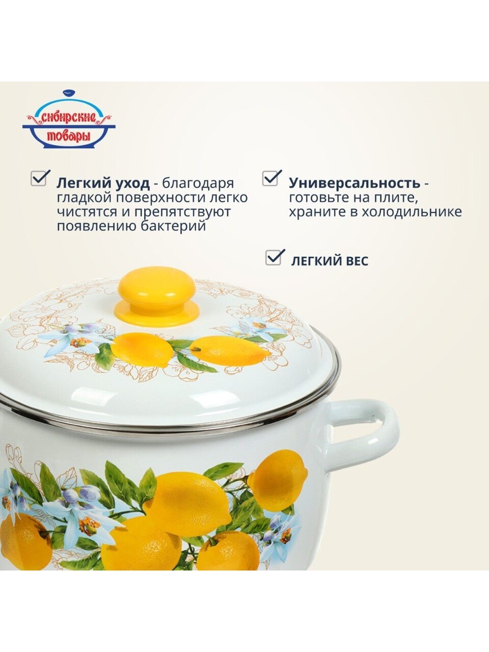 Если вы ищете, какую кастрюлю купить недорого для дачи или подарка, «Лимоны» — практичный вариант: стильный дизайн, универсальность и простота ухода. Кастрюля не требует специальных средств для мытья, не ржавеет, подходит для каждодневного использования.