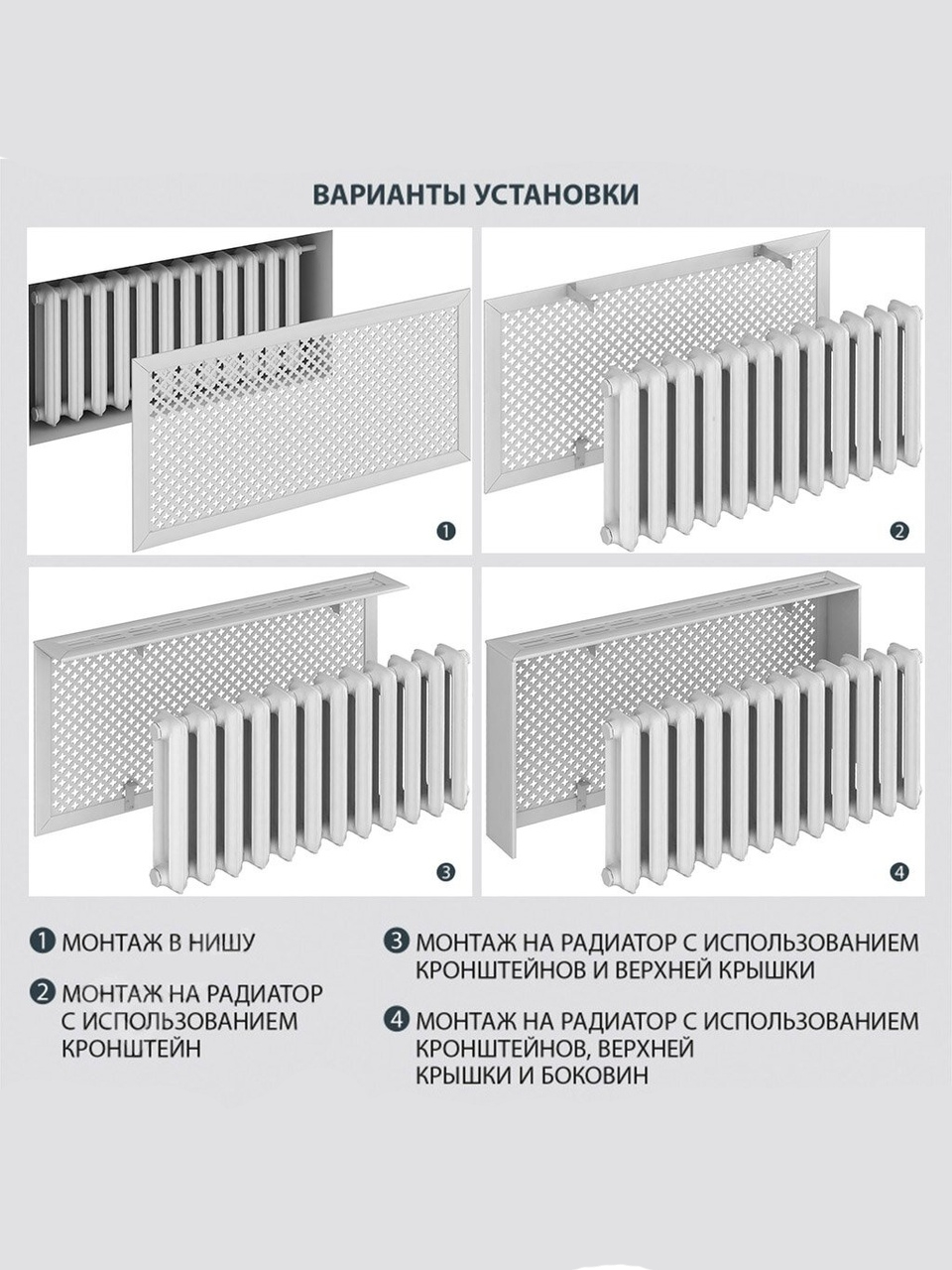 - Установка экрана проста и не требует особых навыков или инструментов. Легко снимается для доступа к радиатору в случае необходимости его чистки или ремонта.