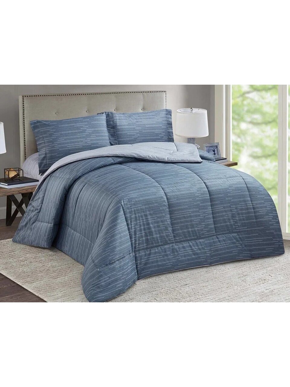 В комплекте: пододеяльник 200х220 см, простыня 230х250 см, две наволочки 50х70 см. Одеяло также 200х220 см — подходит для евро-кроватей.