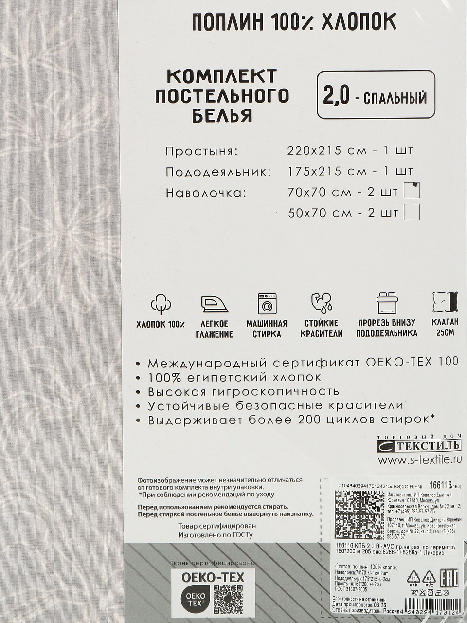 Вы можете приобрести «Постельное белье 2-спальное, простыня 160х200 см, 2 наволочки 70х70 см, пододеяльник 175х215 см, простыня на резинке, Bravo, поплин, Ликорис» и другие товары в нашем интернет-магазине в Иваново по низким ценам и с бесплатным самовывозом.