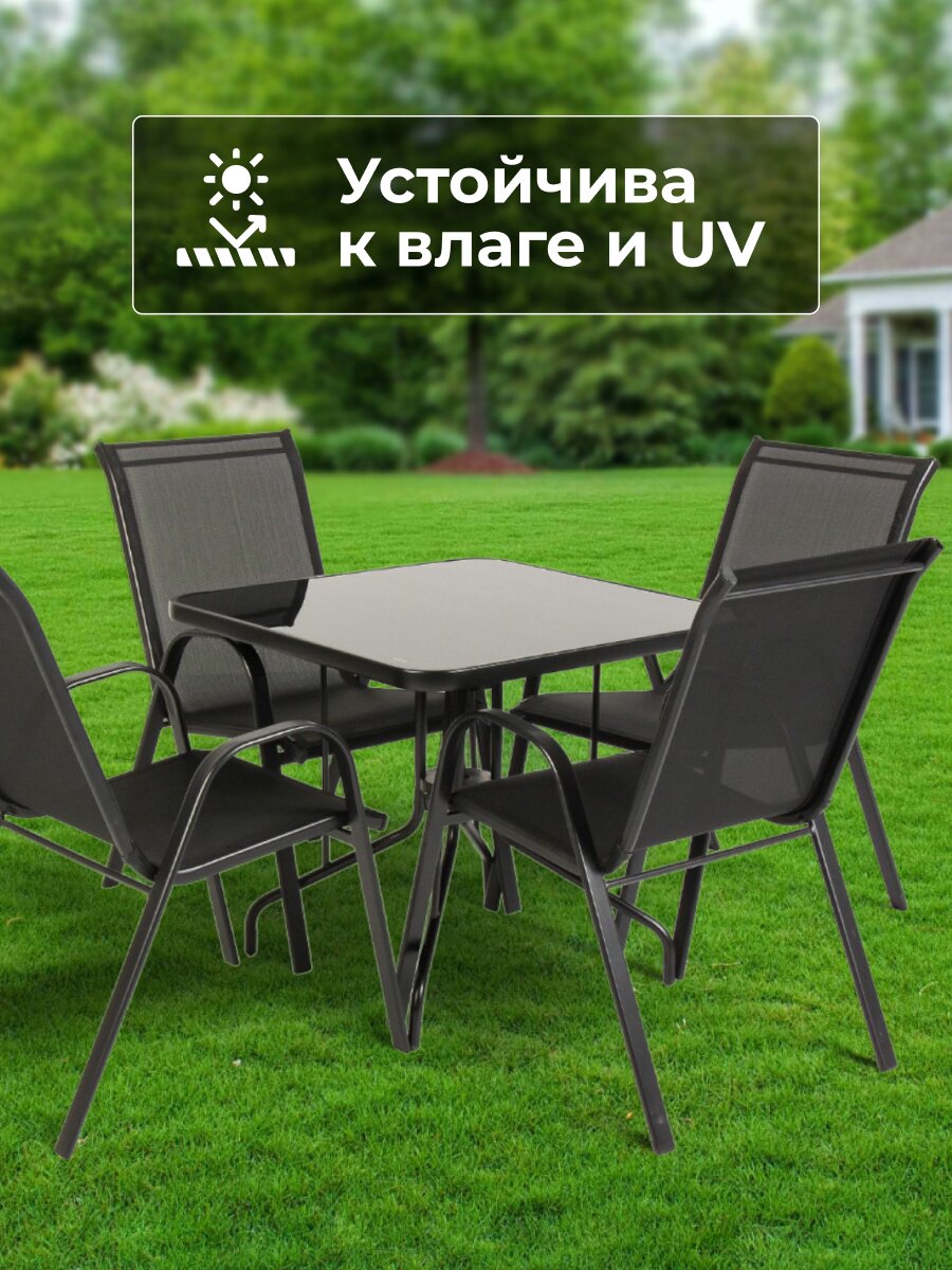 Садовая мебель Тиба — стильное и практичное решение для обустройства дачного участка, террасы, уличного кафе или домашней кухни. Современный дизайн и универсальный черный цвет гармонично впишутся в любой ландшафт или интерьер, подчеркивая вкус и заботу о комфорте. Комплект состоит из квадратного стола размером 80х80х70 см со столешницей из прочного стекла и четырех удобных стульев с жестким сиденьем (размер стула — 59х58х95 см). Такой набор рассчитан на комфортное размещение четырех персон, что идеально подходит для семейных обедов и дружеских встреч на свежем воздухе.