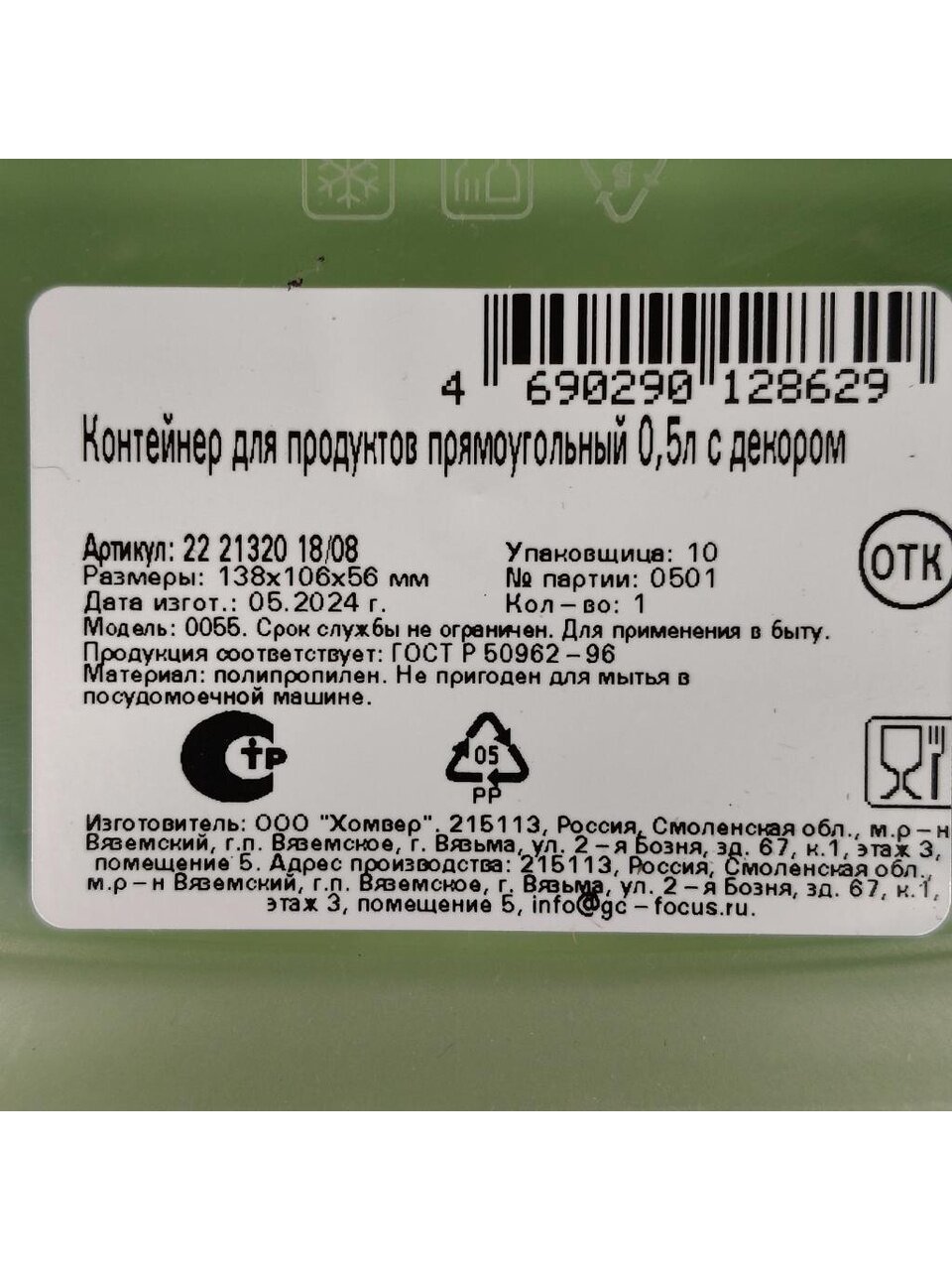 Контейнер пищевой Homver Botanica 0.5 л: удобно хранить продукты дома и на даче, оптимальный размер, безопасный пластик, выгодная цена.