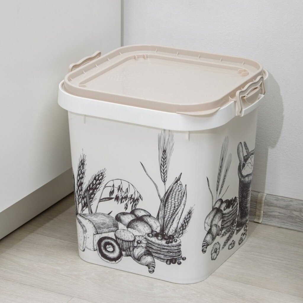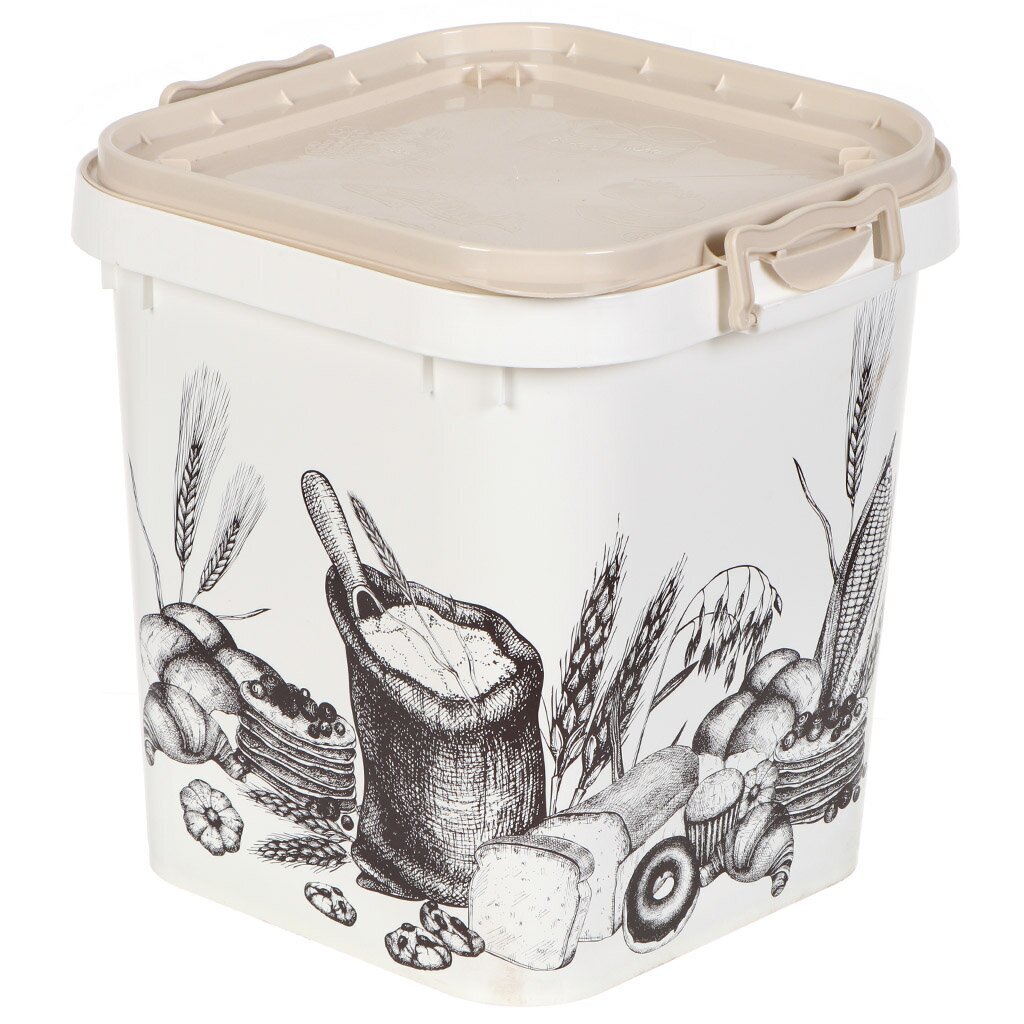 Изделие предназначено для хранения таких сыпучих продуктов, как мука и сахар. Об этом сообщает яркий рисунок, нанесенный по технологии IML. Декор не стирается и не повреждается в процессе эксплуатации. Ёмкость удобна тем, что имеет оптимальный объём 25л, позволяющий долго не пополнять запасы. Широкая квадратная форма и возможность ставить ёмкости друг на друга дают изделию дополнительный комфорт, помогают экономно использовать пространство. Плотно прилегающая крышка фиксируется на изделии при помощи ручек-защелок и надежно защищает содержимое от проникновения влаги и посторонних запахов. Данная емкость рассчитана ориентировочно на 16 кг. муки.