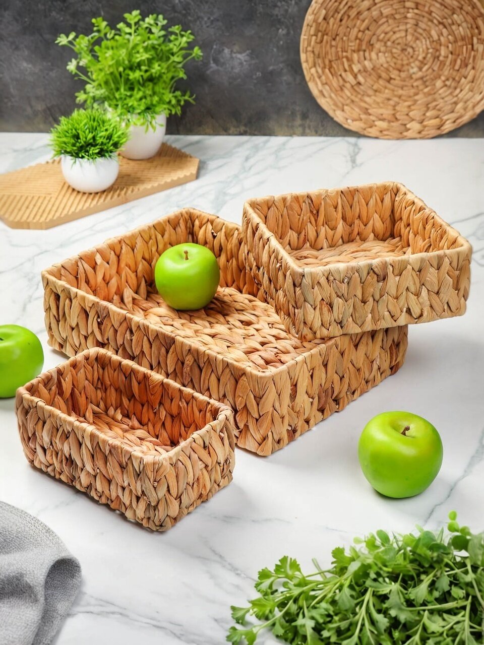 Набор плетёных корзин из четырёх штук — это стильный и функциональный аксессуар для вашего дома. Они прекрасно подойдут для хранения предметов хобби, одежды, книг и многого другого. Корзины станут отличным дополнением к вашему домашнему декору и помогут организовать пространство, обеспечивая порядок и удобство использования.