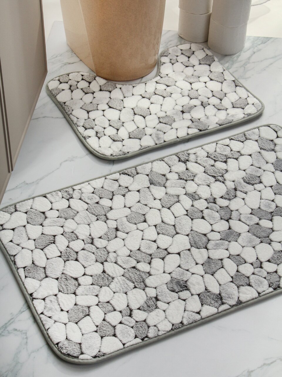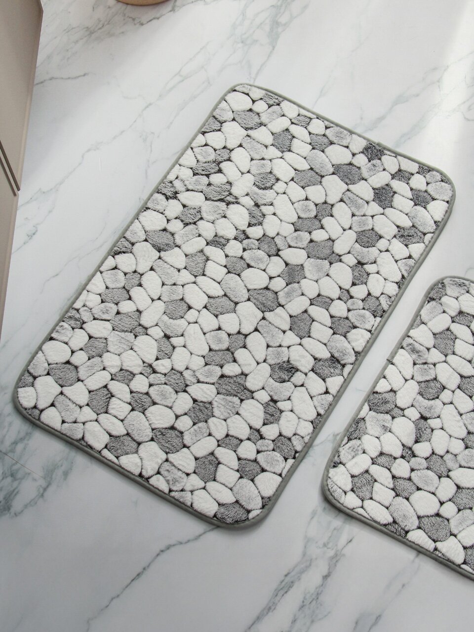 Набор ковриков для ванной комнаты с узором под серую гальку — это не только эстетика, но и функциональность. Благодаря влаговпитывающему и быстросохнущему материалу, коврики быстро избавляют пол от влаги и предотвращают образование луж. Если вы ищете, какой коврик выбрать для ванной, чтобы он не скользил и не требовал сложного ухода, обратите внимание на эту модель: полиэстер приятен на ощупь, не вызывает аллергию и прост в уходе.