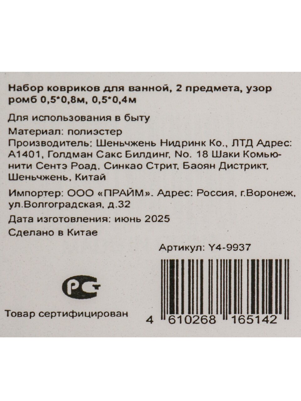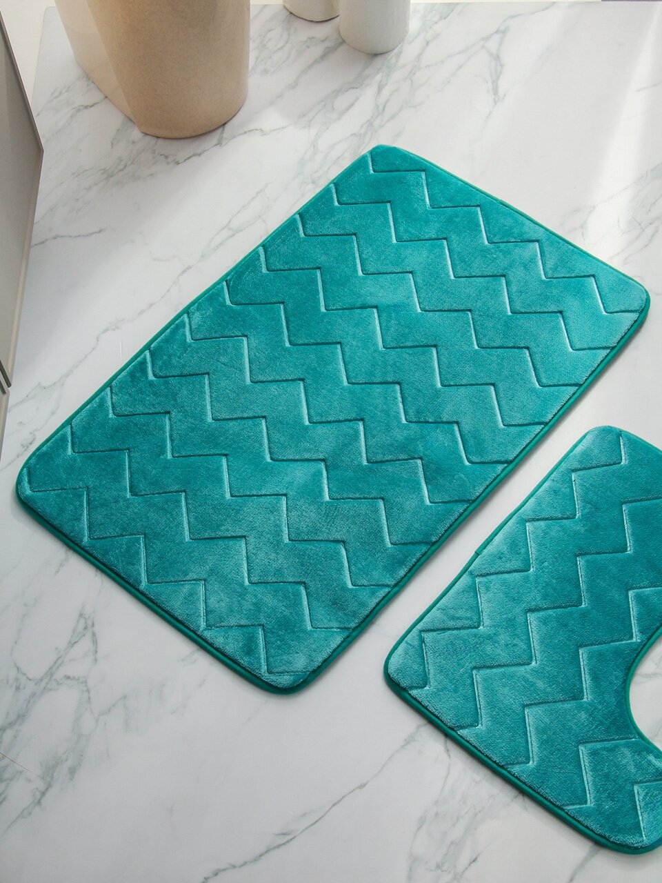 Оба коврика изготовлены из полиэстера: материал прочный, влаговпитывающий, устойчив к истиранию и сохраняет цвет после стирки.
