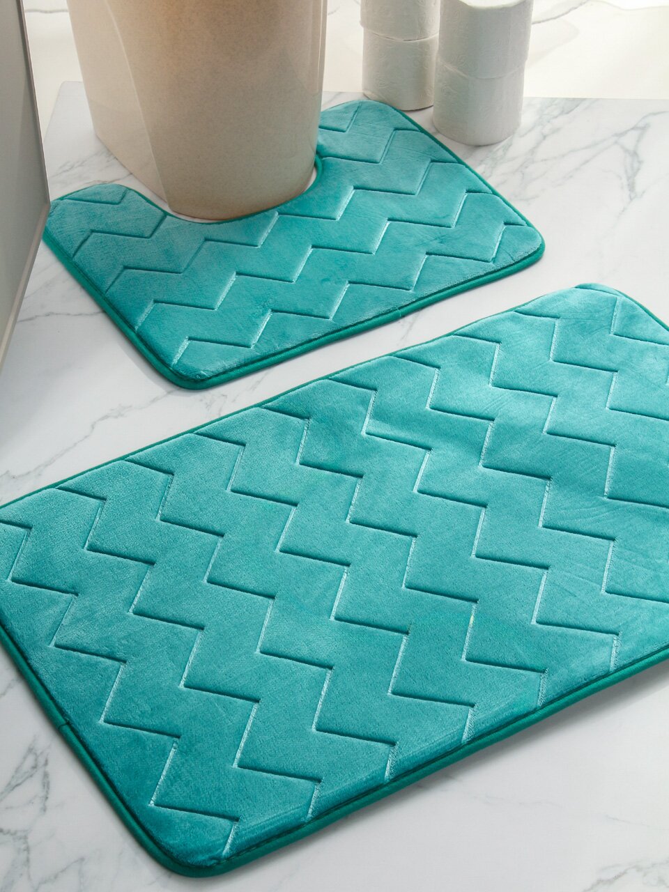 Набор ковриков для ванной 2 шт. бирюзового цвета с геометрическим узором: быстро сохнут, впитывают влагу, подходят для дома и дачи — комфорт без компромиссов.
