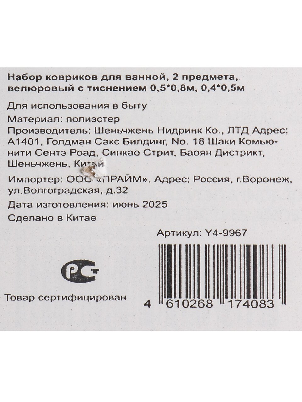 В комплекте два коврика: большой — 50×80 см, малый — 40×50 см. Оба прямоугольной формы, подходят для ванной и туалета.