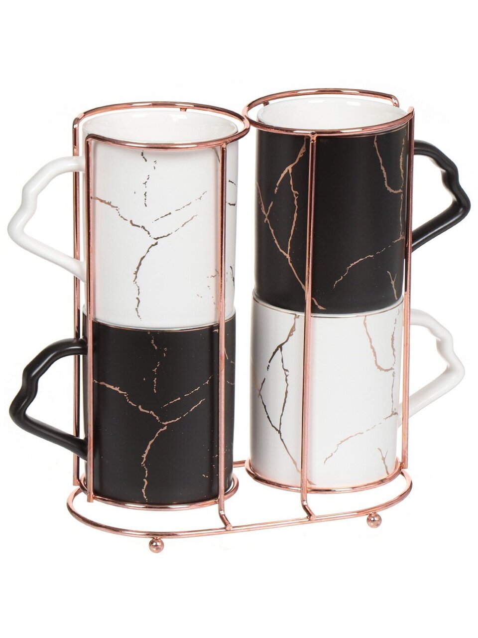 Объем каждой кружки — 340 мл (округлённо 350 мл). Материал — керамика, подставка выполнена из металла. В комплекте 4 кружки и металлическая подставка.