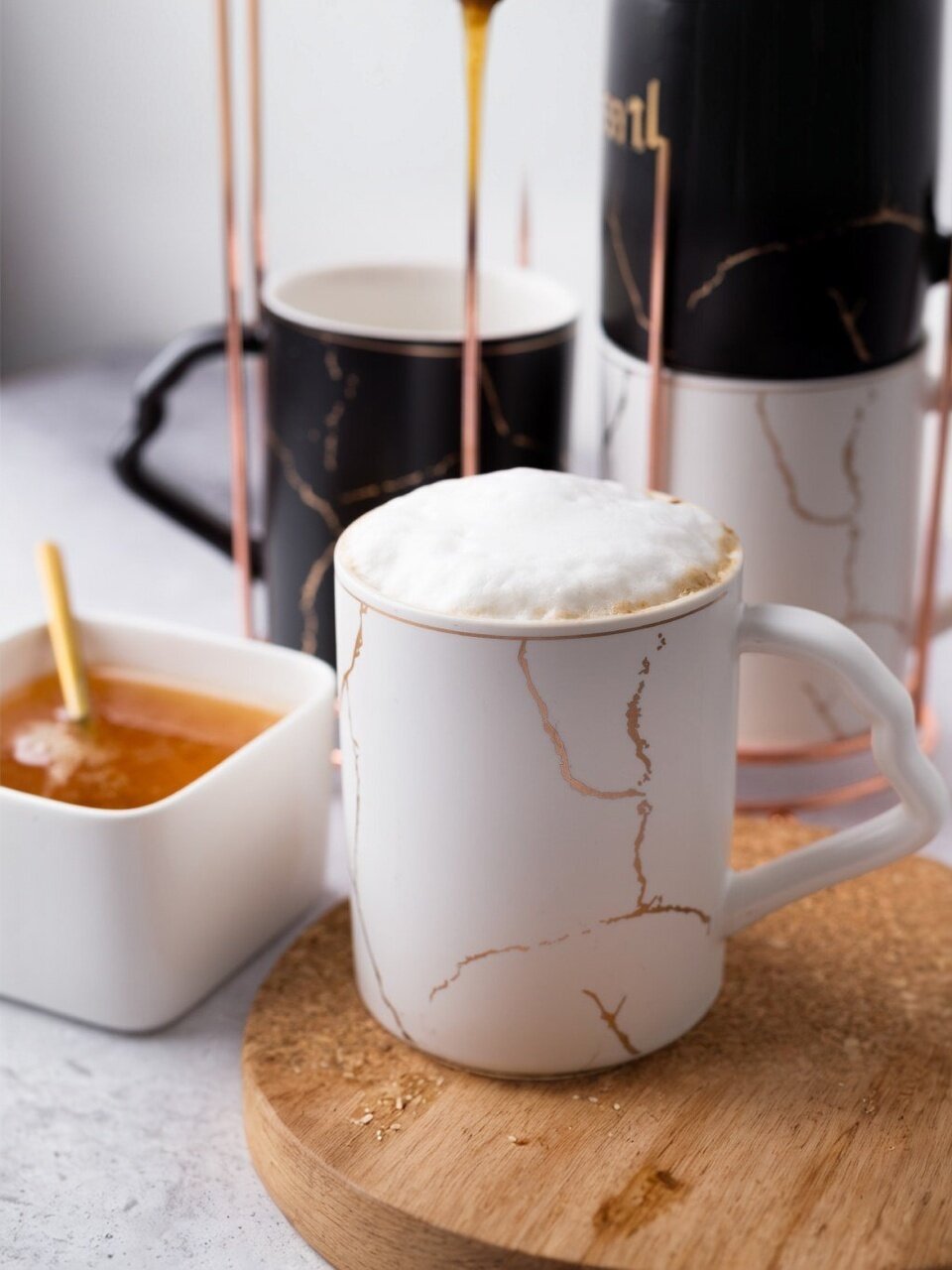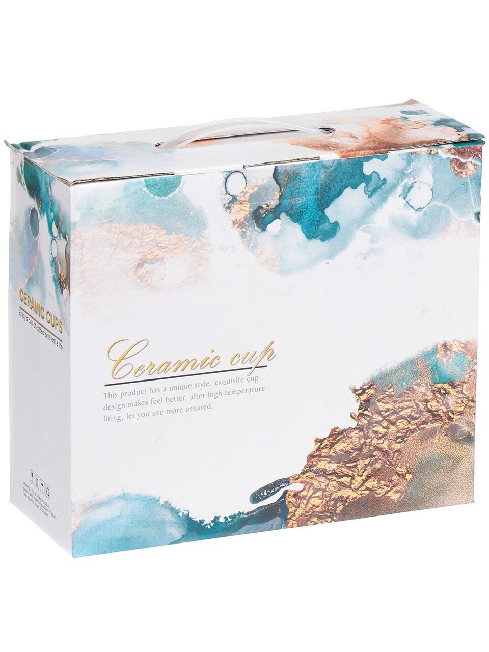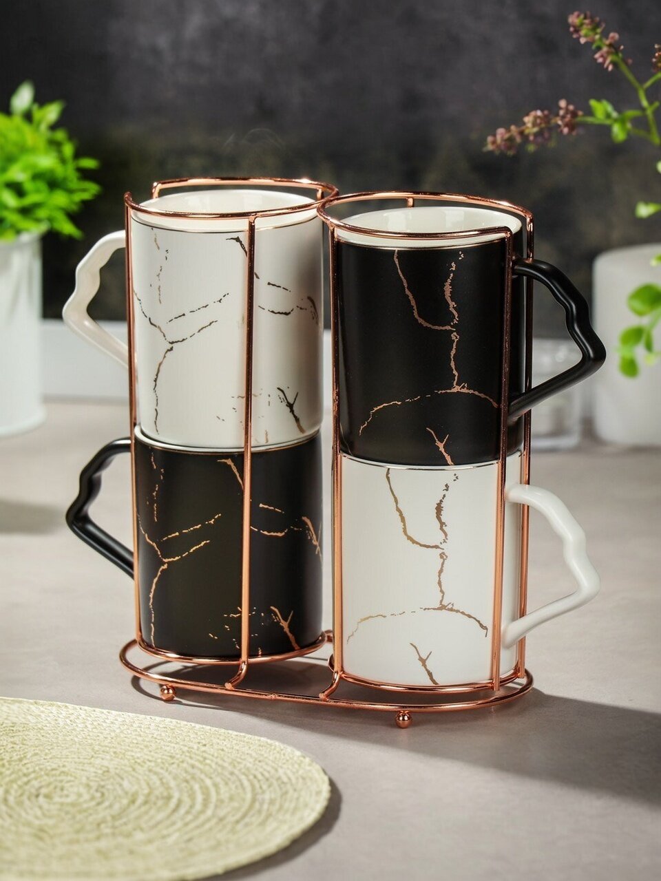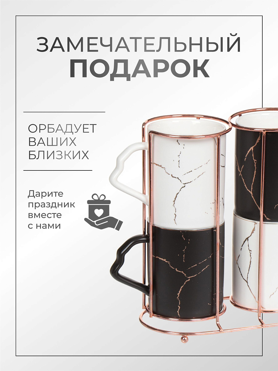 Этот набор керамических кружек с металлической подставкой — отличный вариант для тех, кто ищет, какую кружку выбрать для дома или дачи. Керамика сохраняет температуру напитка, а объем 340 мл идеально подходит для чая, кофе, какао. Благодаря подарочной упаковке и стильному мраморному дизайну, набор станет уместным презентом на любой случай.