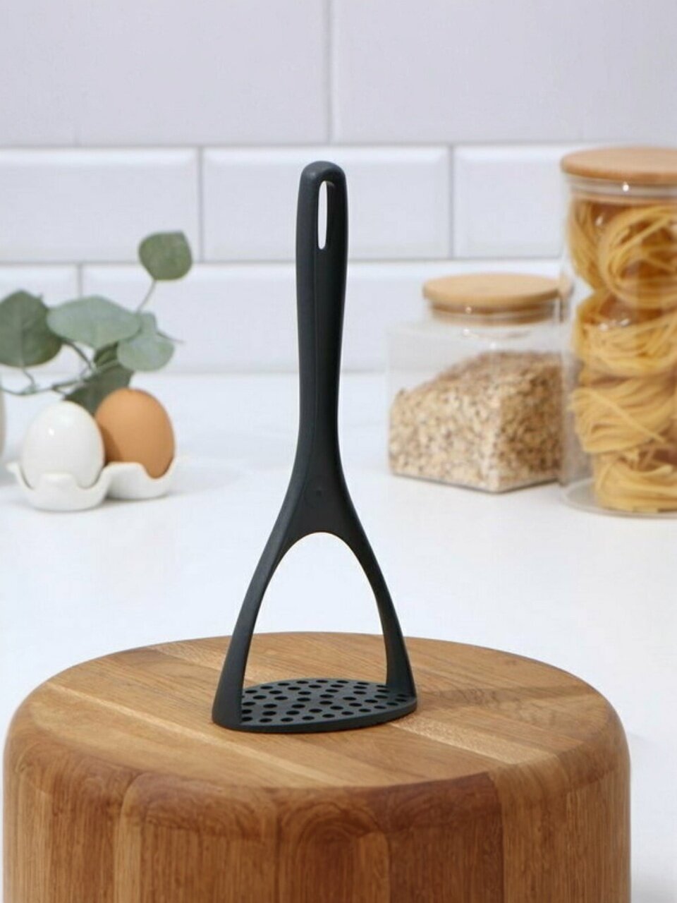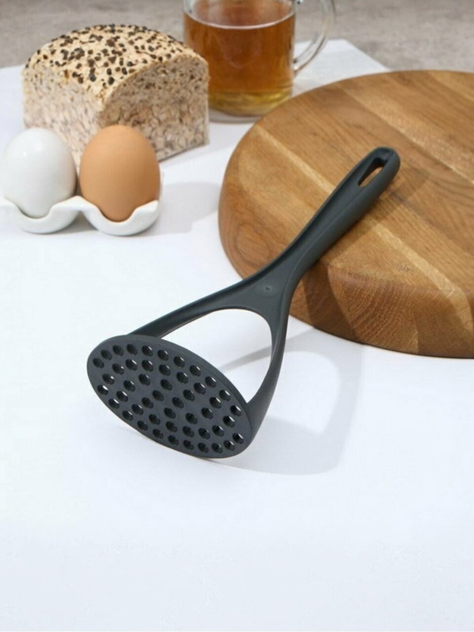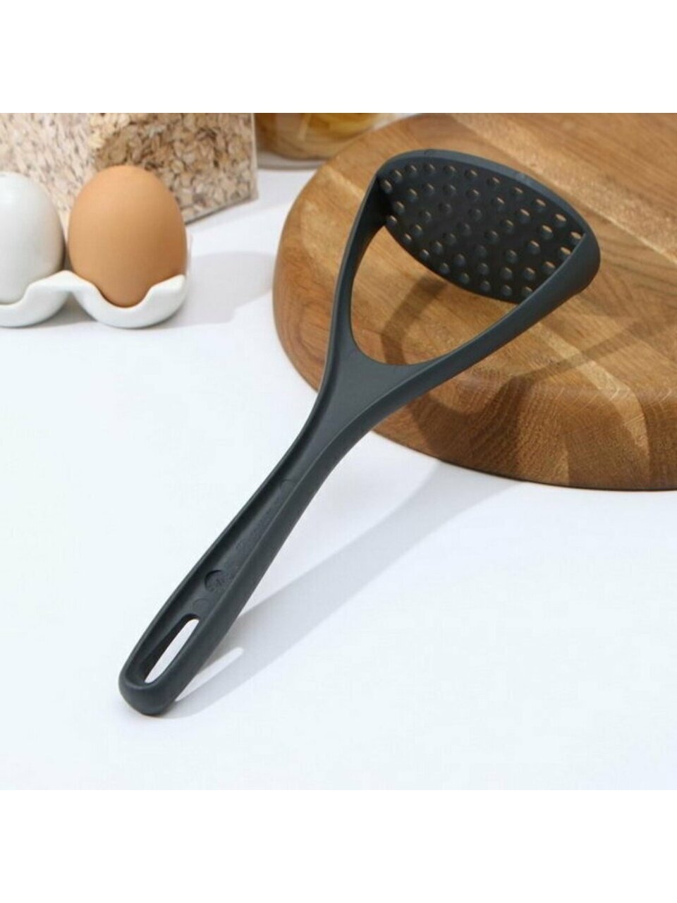 - Отверстие в верхней части ручки позволяет хранить картофелемялку в подвешенном состоянии, что существенно экономит место на кухне.