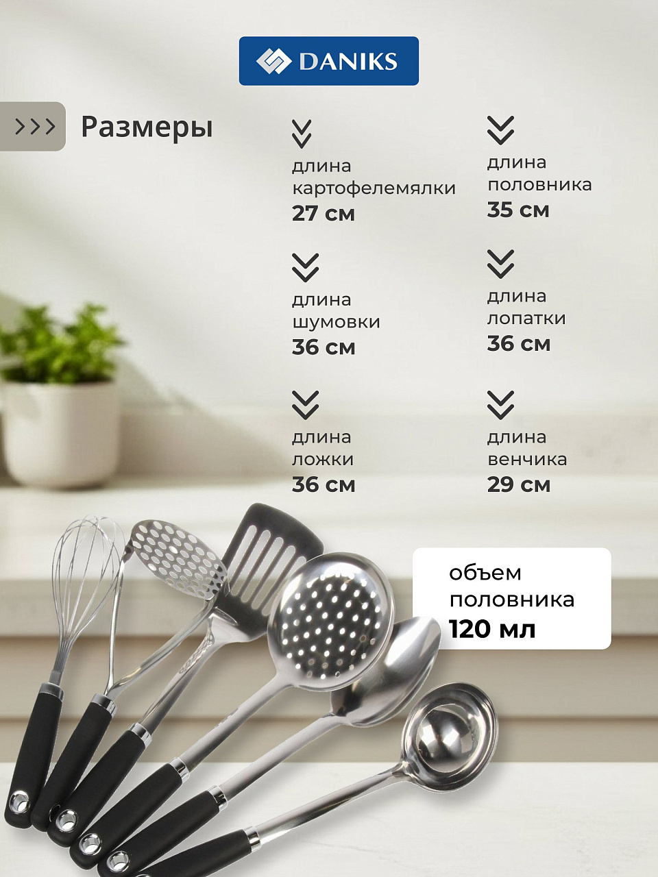 - длина картофелемялки 27 см, половника 35 см, ложки 36 см, венчика 29 см, шумовки 36 см, лопатки 36 см.