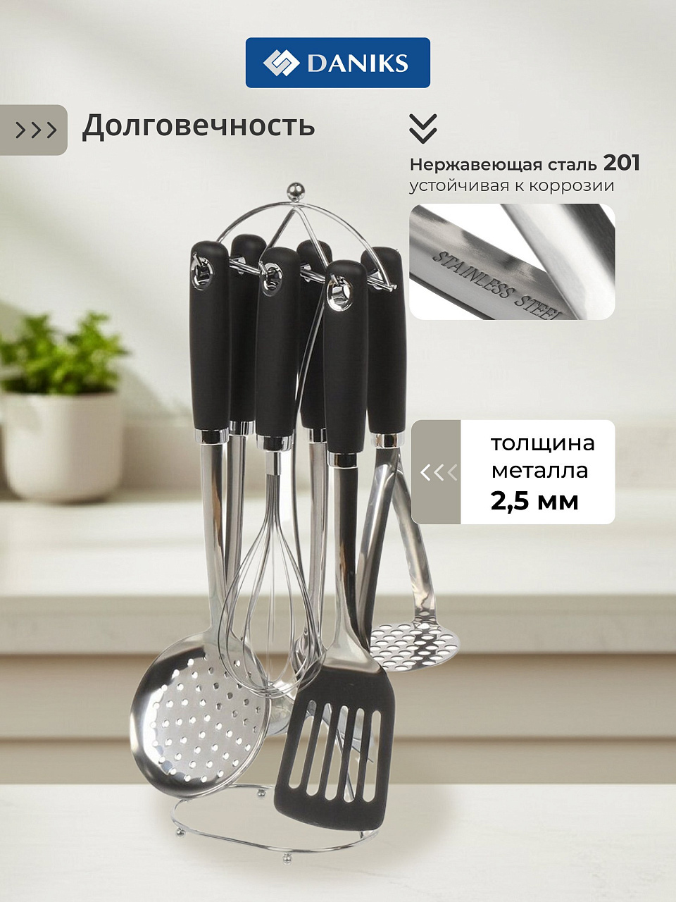 Представляем набор кухонных принадлежностей, который станет незаменимым помощником на любой кухне. Этот комплект, состоящий из 7 предметов, не только функционален, но и стильный, что делает его идеальным выбором для тех, кто ценит качество и элегантность. Изготовленный из нержавеющей стали, он отличается прочностью и долговечностью, а черный цвет придаст вашей кухне современный вид.