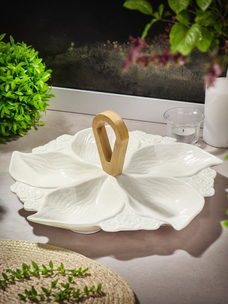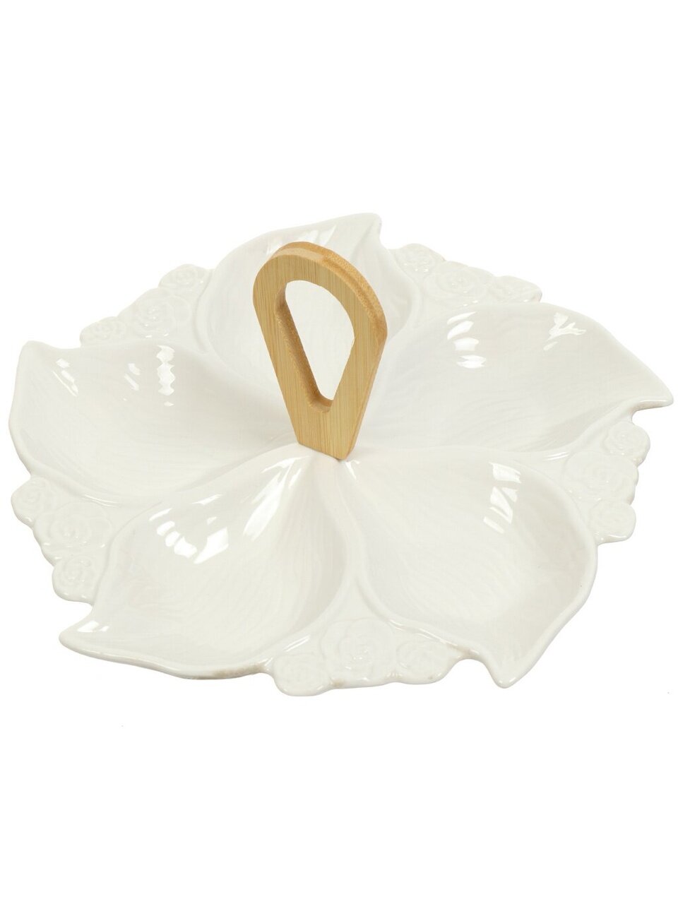 Менажница понадобится для хранения сразу нескольких блюд и для подачи на стол. Выполнена в виде круглого блюда из 5 секций. С помощью такой менажницы можно подать на стол сразу несколько блюд в пределах одной посуды, при этом не смешивая их между собой. Такая замысловатая вещь идеально подходит для сервировки определенных блюд, например: варенья, снеков или соусов, салатов, заправок и вторых блюд, рыбу со всякими соусами и прочие закуски.