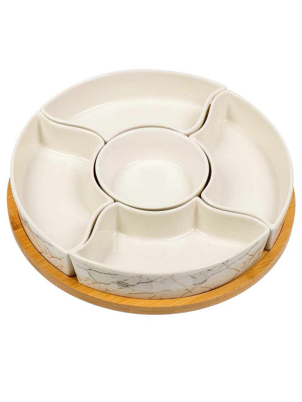 Вы можете приобрести «Менажница керамика, 30 см, 5 секций, бамбуковая подставка, Белый мрамор с золотом, Y4-6601» и другие товары в нашем интернет-магазине в Астрахани по низким ценам и с бесплатным самовывозом.