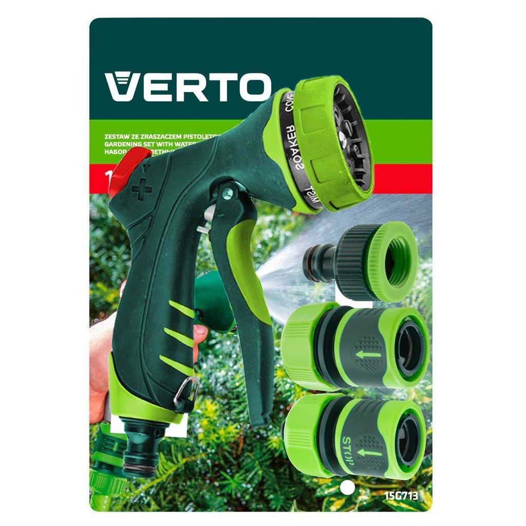 Набор с оросителем пистолетного типа, двухкомпонентными муфтами и адаптером на кран VERTO (арт. 15G713). В набор входят 4 элемента: ороситель пистолетного типа, 7 функций, сквозная муфта 1/2", муфта с автостопом 1/2", адаптер на кран 1/2".