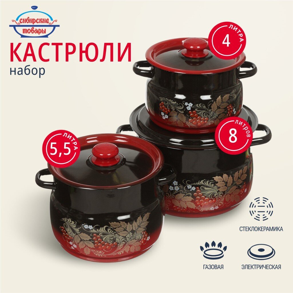 Набор посуды из эмалированной стали "Сибирские товары Рябинка 11" — практичное и стильное решение для современной кухни, сочетающее качество, функциональность и привлекательный дизайн. В наборе представлены кастрюли объемом 4, 5.5 и 8 литров, каждая с удобной стальной крышкой. Такой комплект идеально подойдет для приготовления супов, рагу, компотов и других домашних блюд, позволяя готовить как для небольшой семьи, так и для больших застолий.
