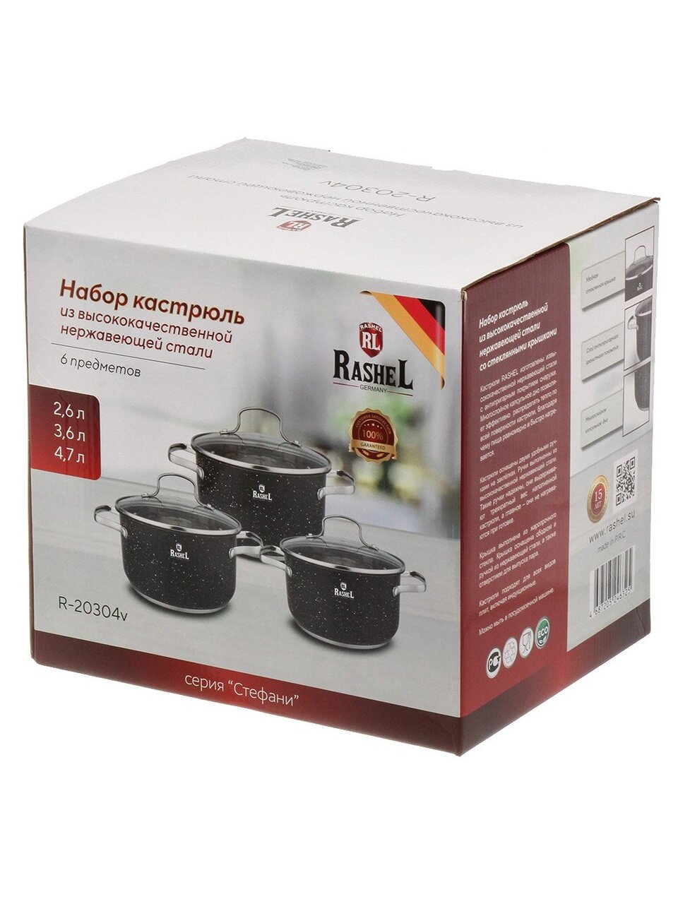 Вы можете приобрести «Набор посуды нержавеющая сталь, 6 предметов, 2.6, 3.6, 4.7 л, индукция, RasheL, R-20304v» и другие товары в нашем интернет-магазине в Орле по низким ценам и с бесплатным самовывозом.