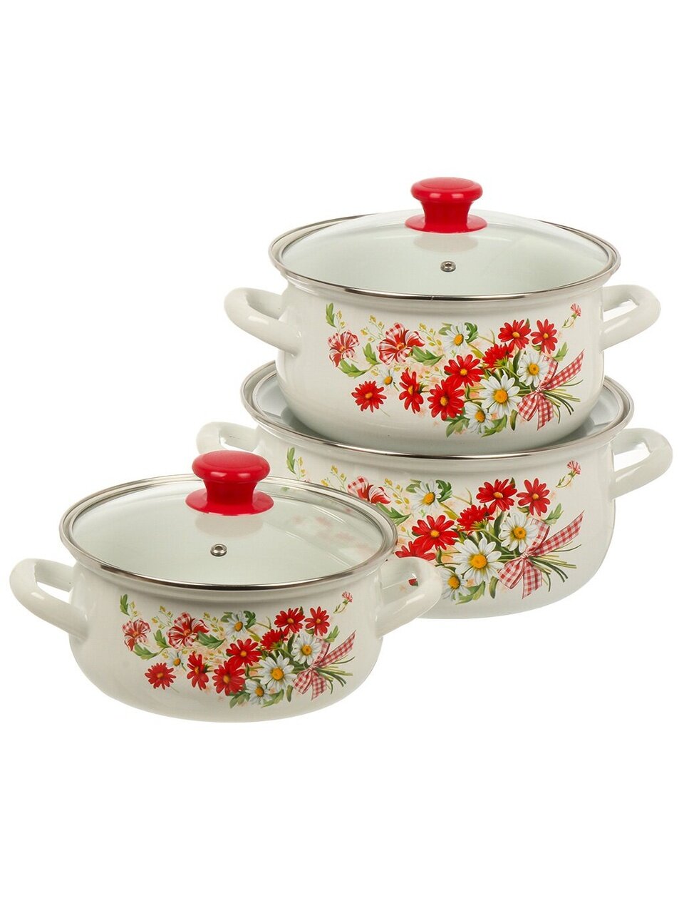 Набор эмалированных кастрюль 2/3/4 л «Астры-1-Экстра» — универсальное решение для дома и дачи: долговечная сталь, стеклянные крышки, гарантия 12 мес.