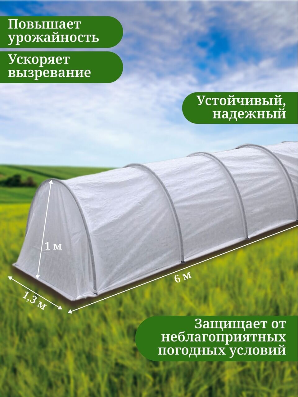 - Компактные размеры: ширина 1.3 м, длина 6 м и высота 1 м позволяют разместить парник даже на небольших участках, не занимая много места.