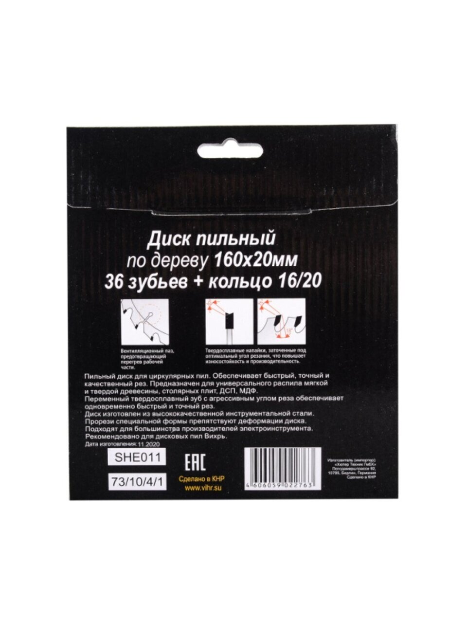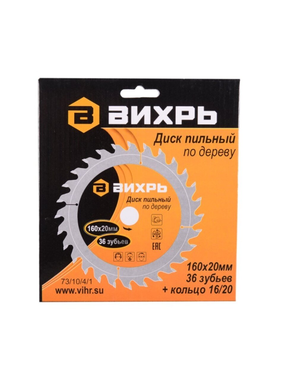 Диск пильный по дереву 160х20/16 мм 36 зубьев Вихрь 73/10/4/1 - предназначается для продольной и поперечной резки древесины, фанерных плит, ДСП, ДВП, а также других древесных материалов. Используется совместно с циркулярными пилами и подобными деревообрабатывающими электроинструментами.