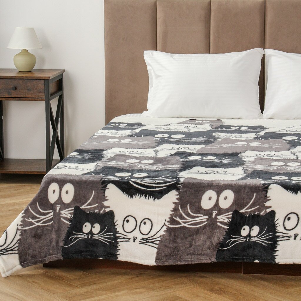 Плед выполнен из 100% полиэстера с коротким плюшевым ворсом, что обеспечивает мягкость, долговечность и простоту ухода. Оригинальный рисунок с котами делает его универсальным подарком и стильным элементом интерьера.